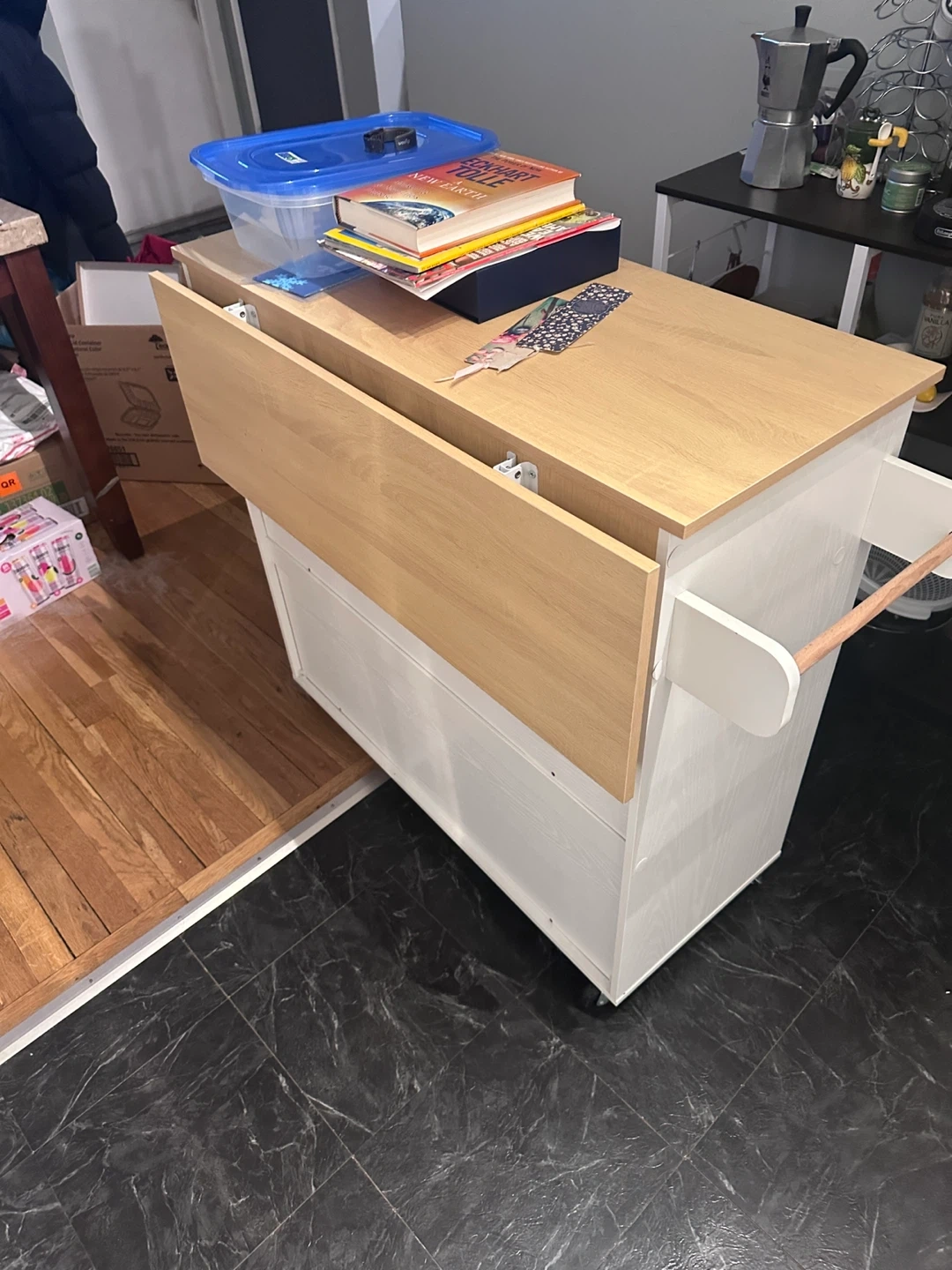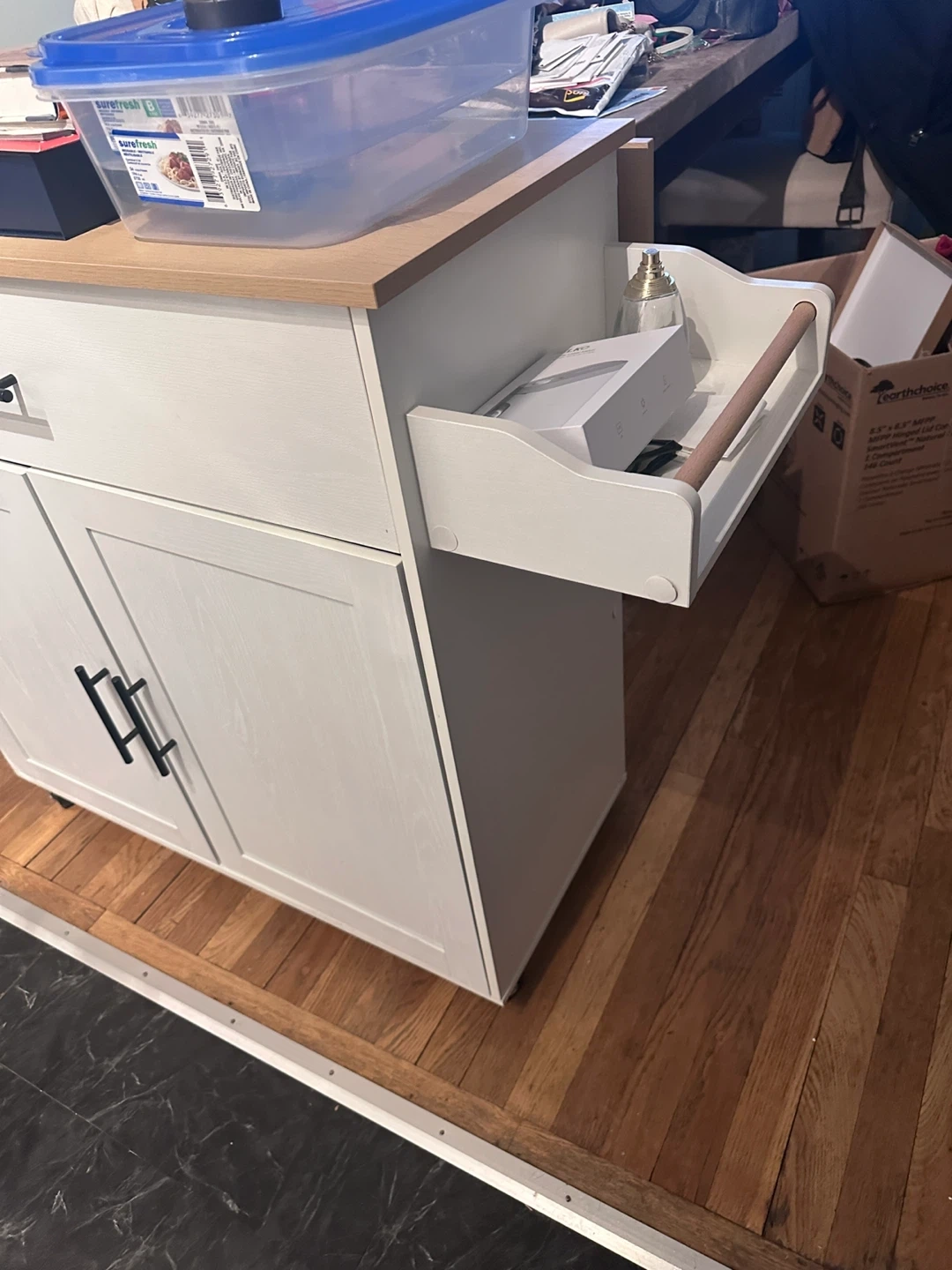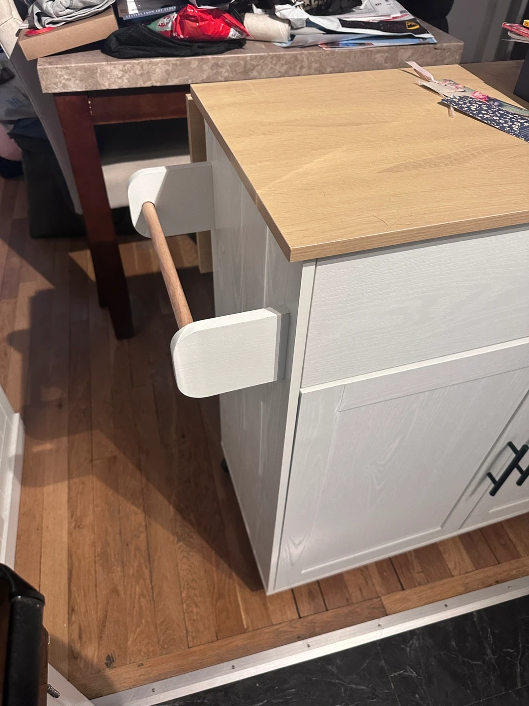 This kitchen island is perfect for adding extra storage and counter space to your kitchen. It features a light wood top and white cabinets with black handles. It has a drawer and open storage space, and a towel rack on the side. Great for small kitchens or apartments!