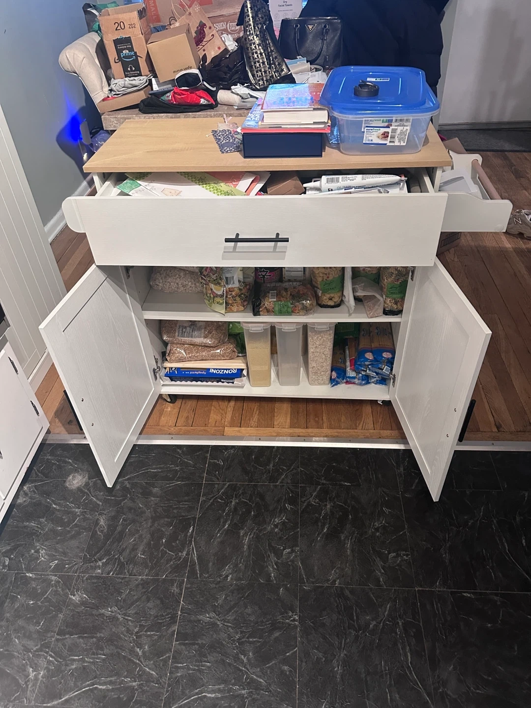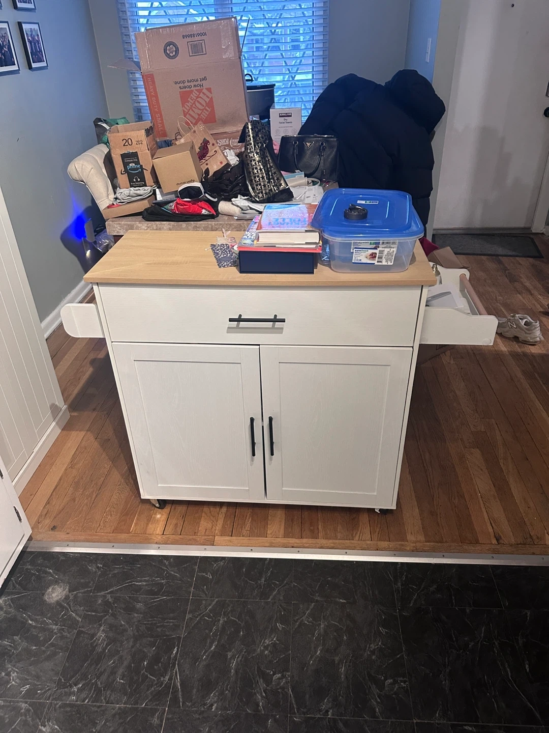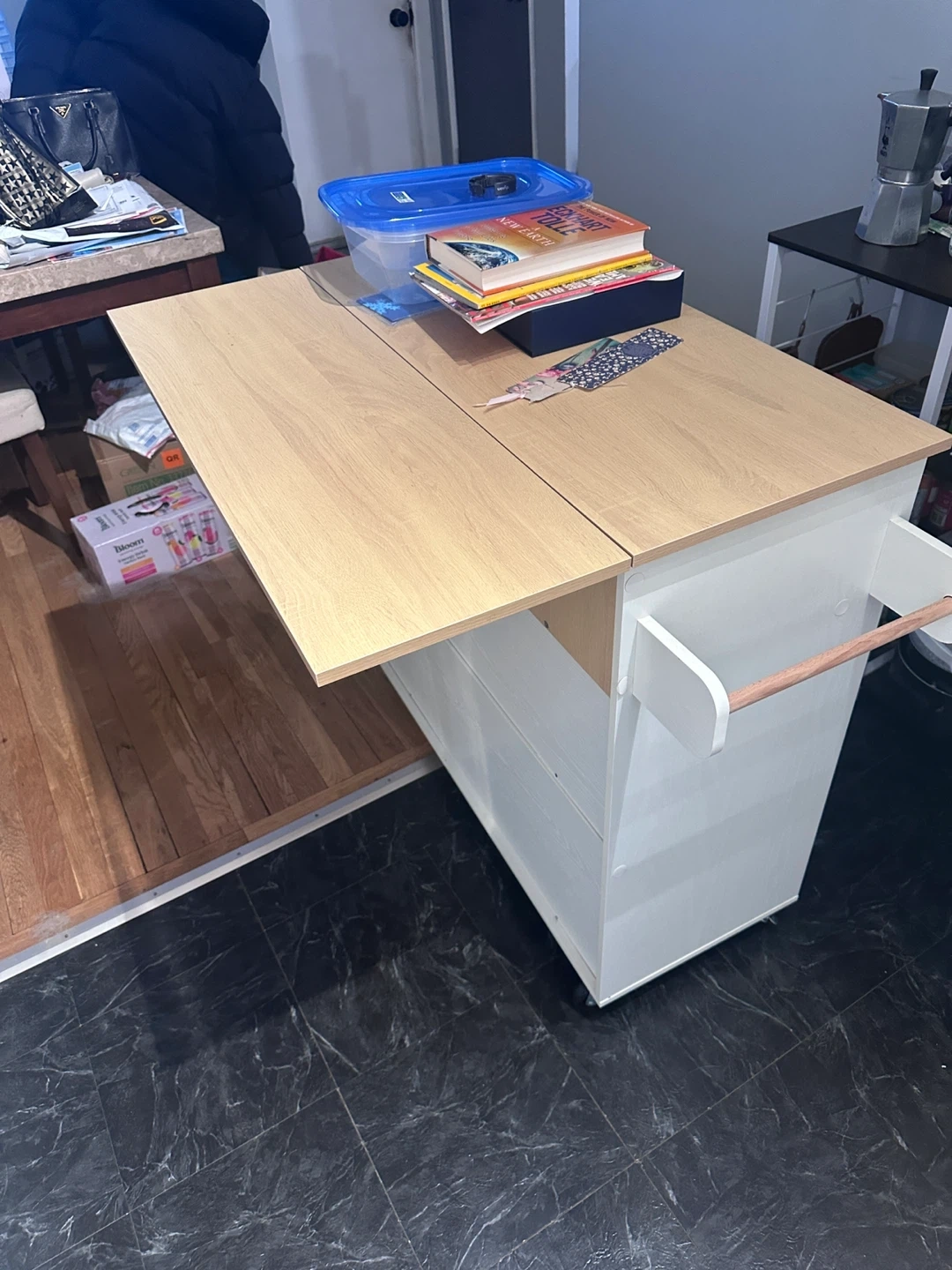 This kitchen island is perfect for adding extra storage and counter space to your kitchen. It features a light wood top and white cabinets with black handles. It has a drawer and open storage space, and a towel rack on the side. Great for small kitchens or apartments!