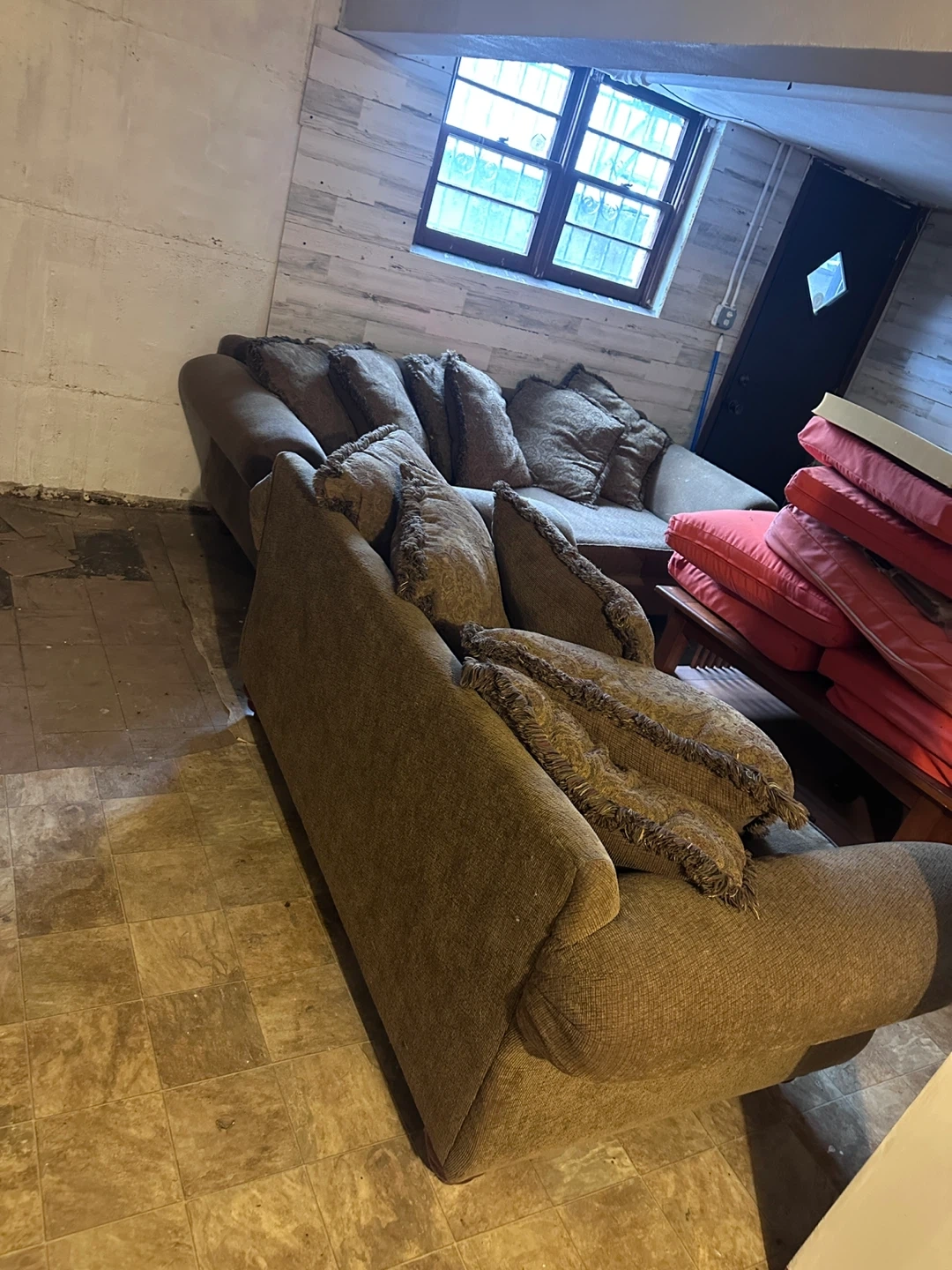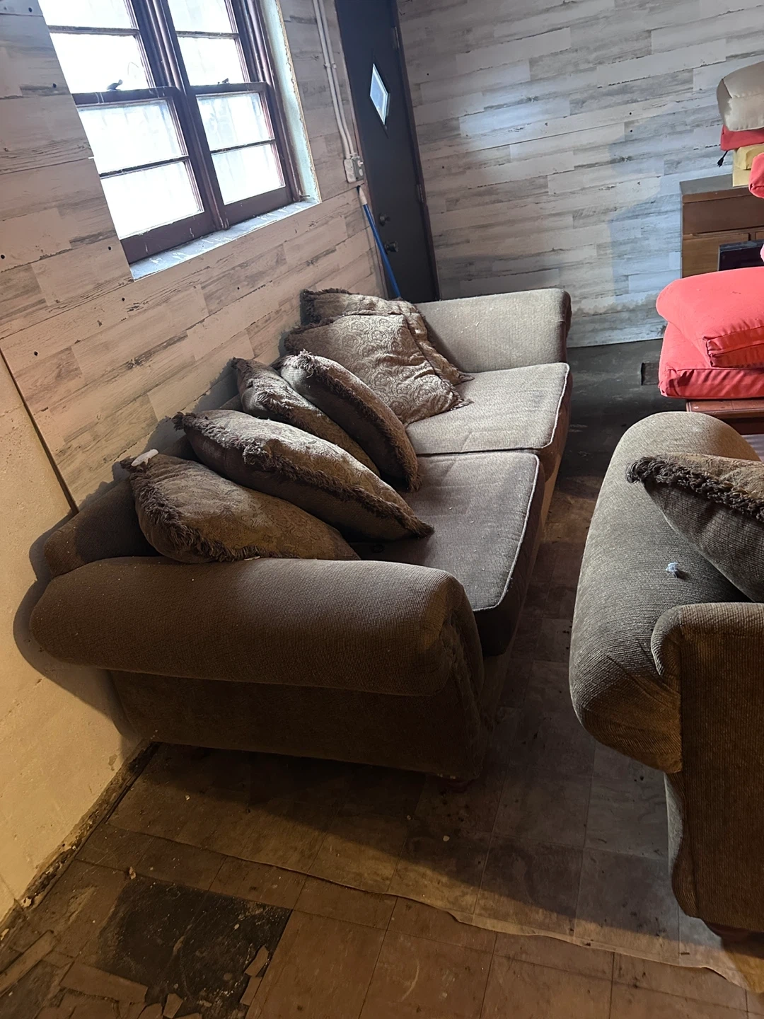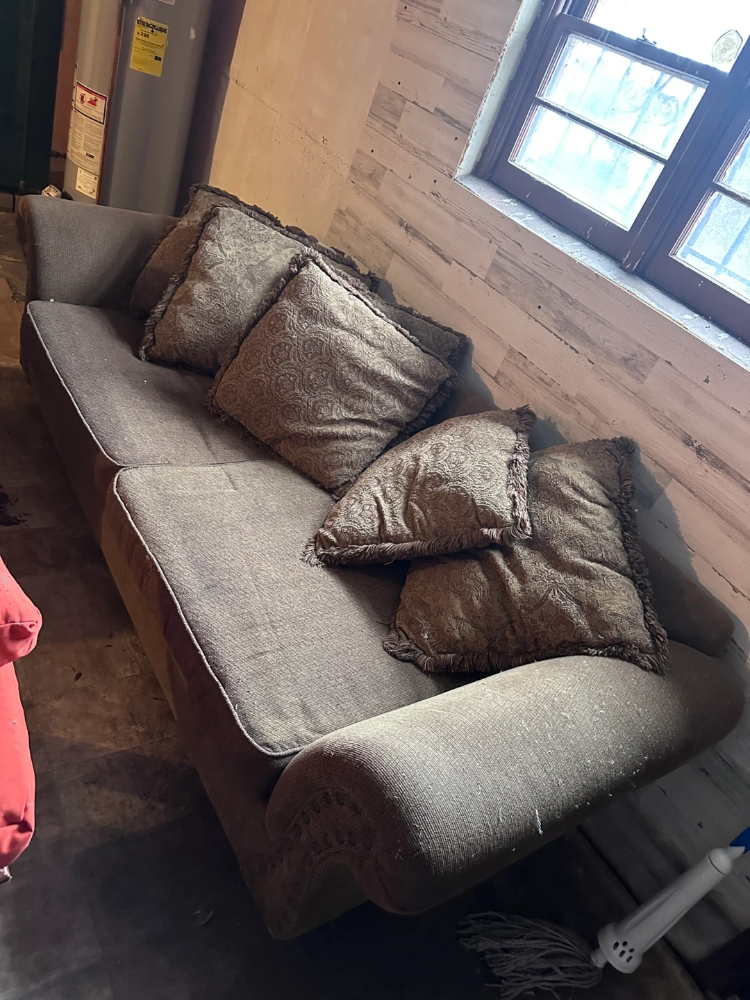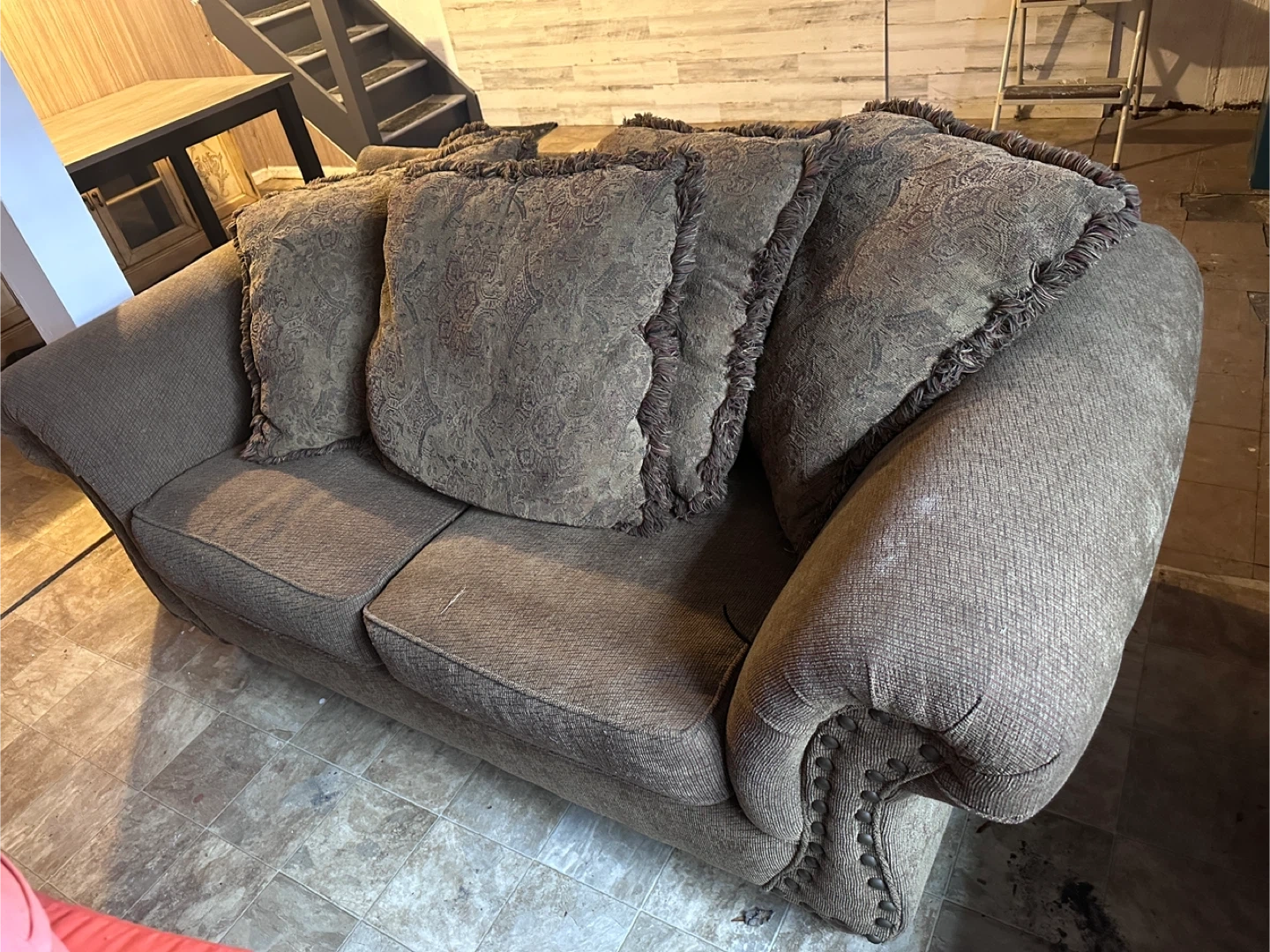 Selling a comfortable brown sofa that comes with matching pillows. It's in good condition and ready to add some cozy vibes to your living space. Perfect for lounging and relaxing!