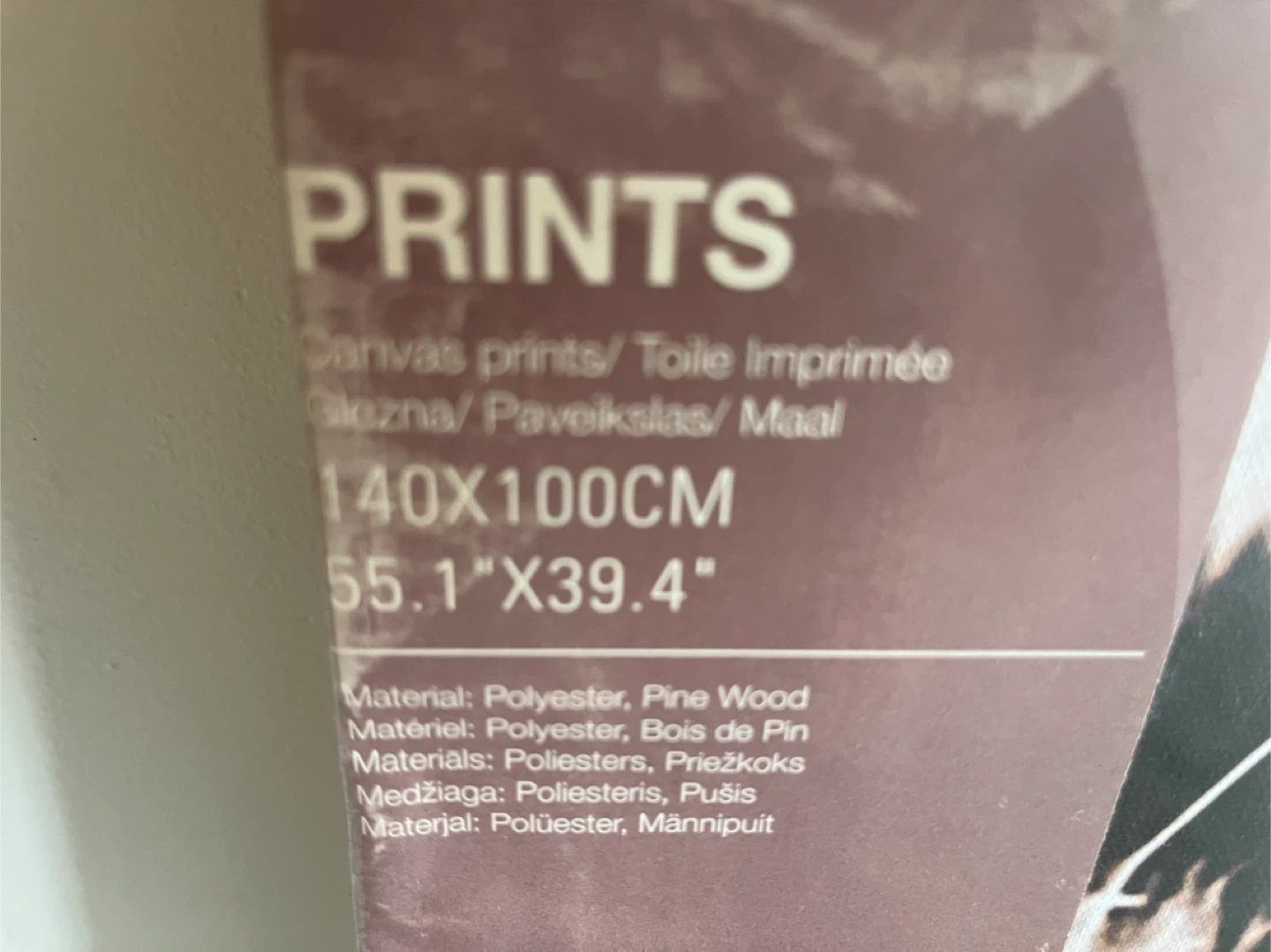 Selling a canvas print featuring a tiger. It measures 140x100cm, which is about 55.1" x 39.4". The material is polyester and pine wood