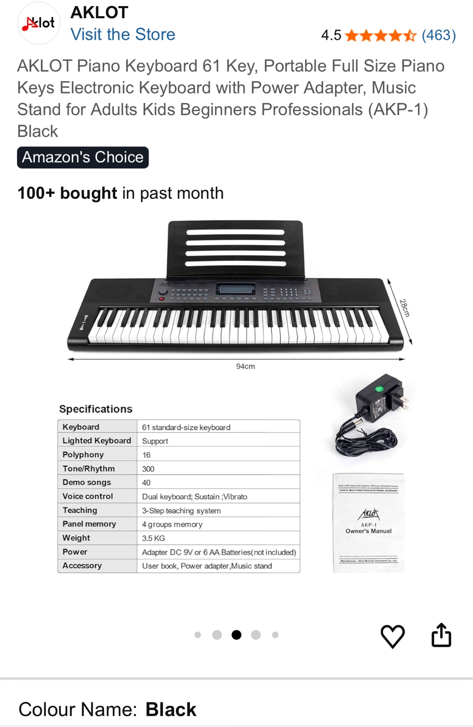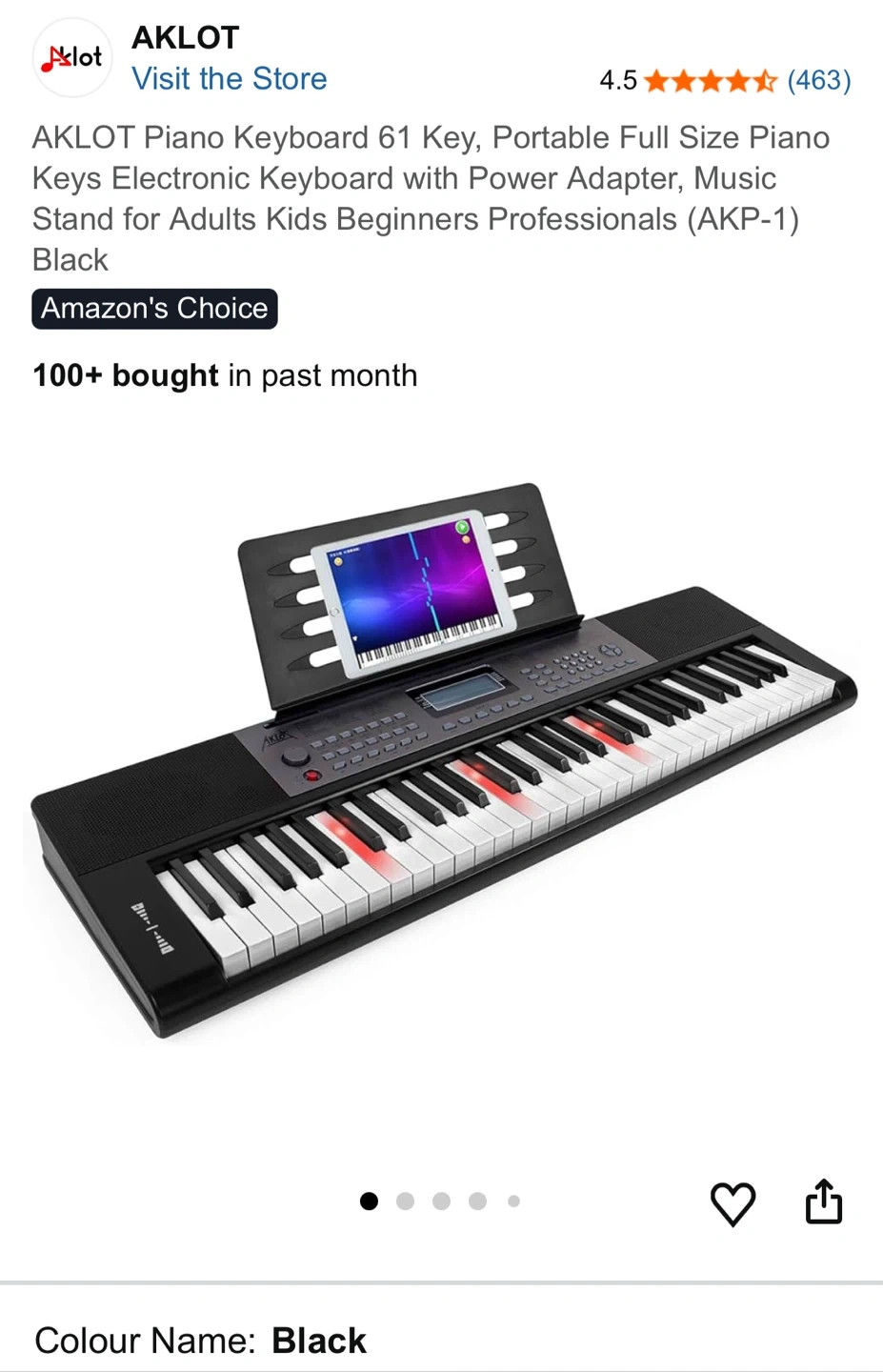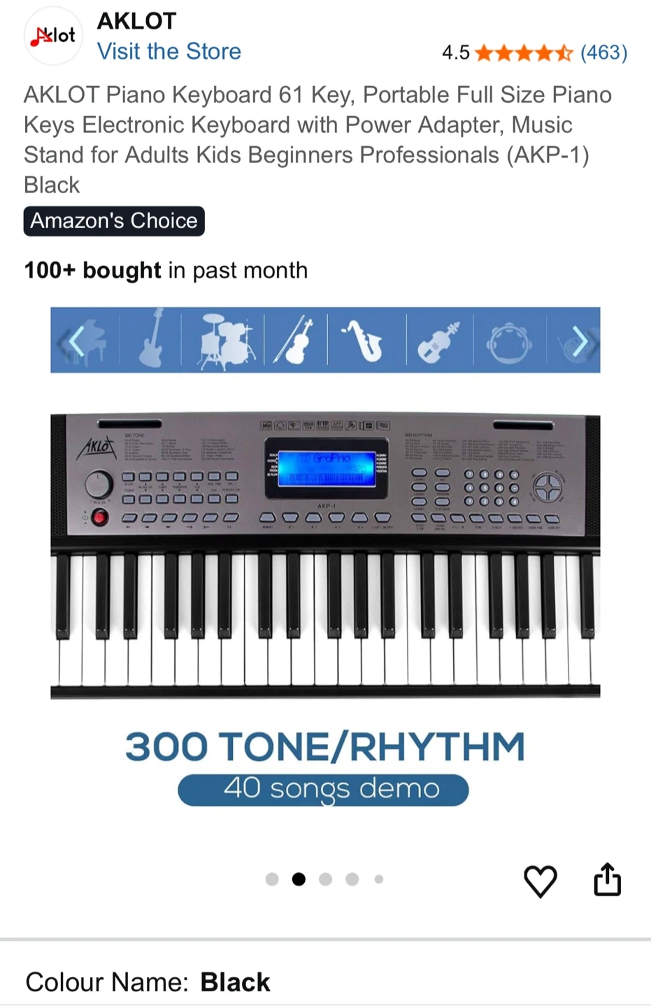 Selling an AKLOT 61-key portable piano keyboard in black. It features a full-size piano keys electronic keyboard with a power adapter and music stand. Great for adults, kids, beginners, and professionals! It has 300 tones/rhythm and 40 demo songs