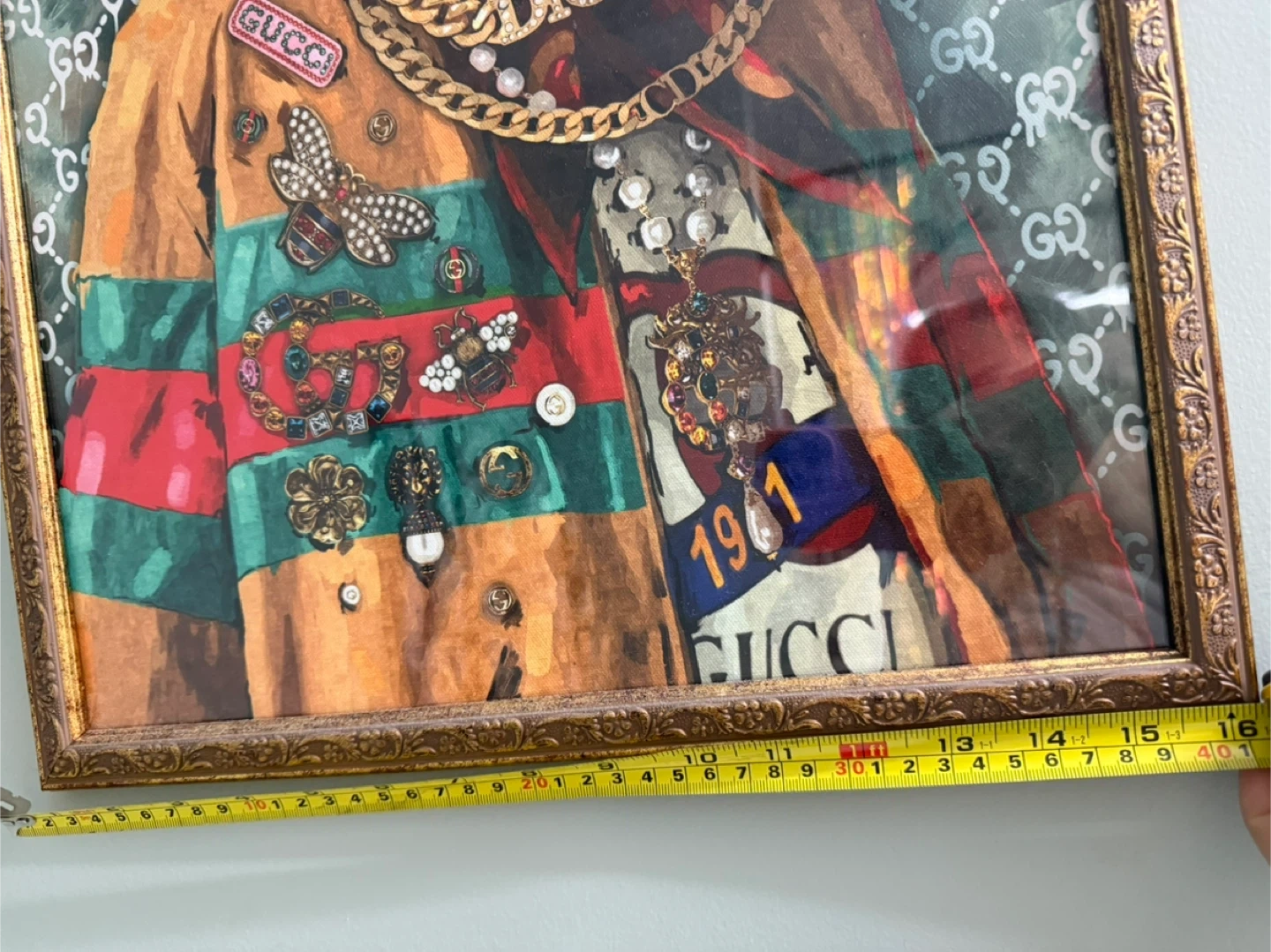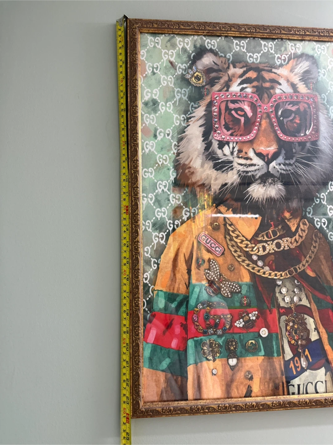 This framed art features a tiger decked out in Gucci-inspired accessories. It measures approximately 16 inches wide and 26 inches tall. A fun piece to add some personality to your space