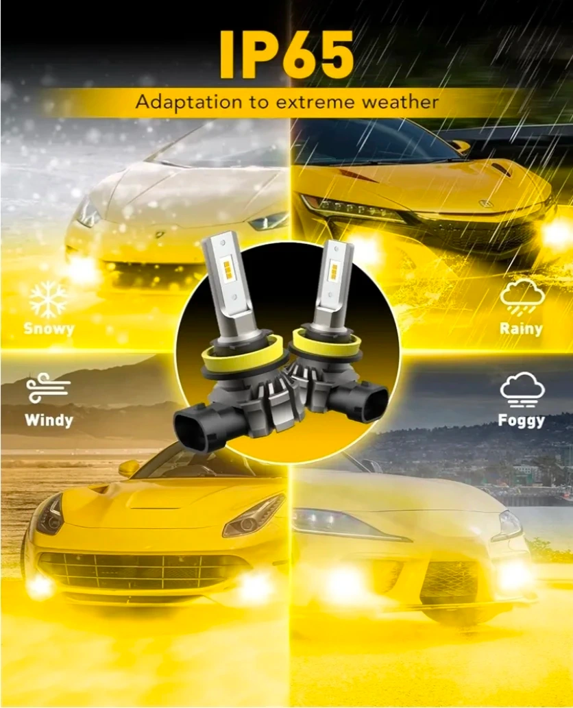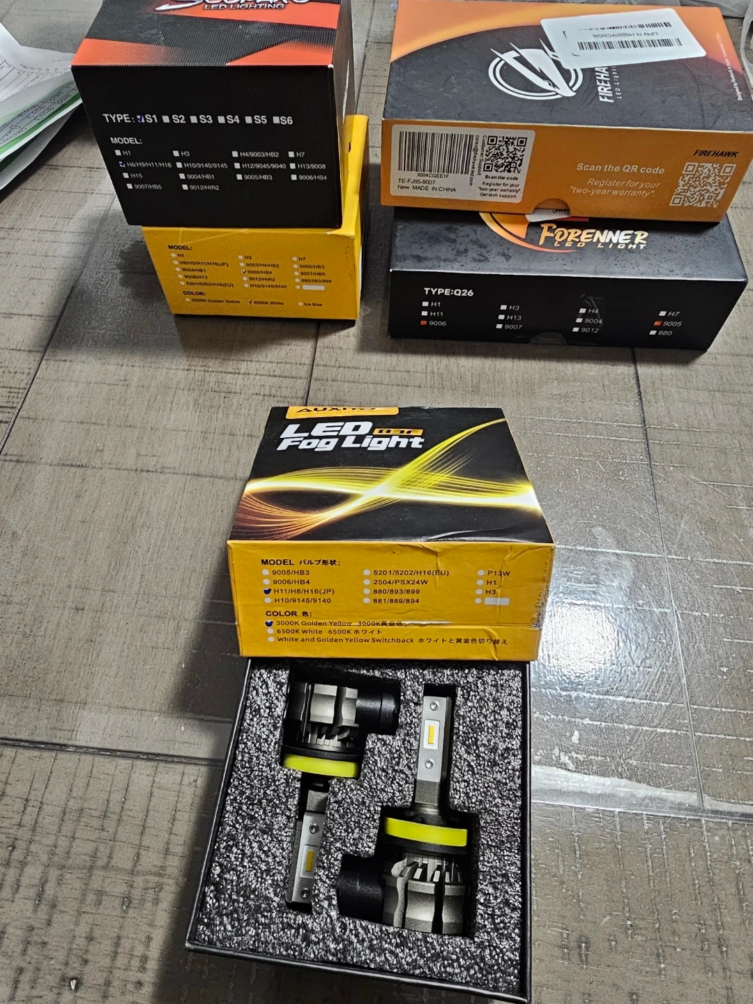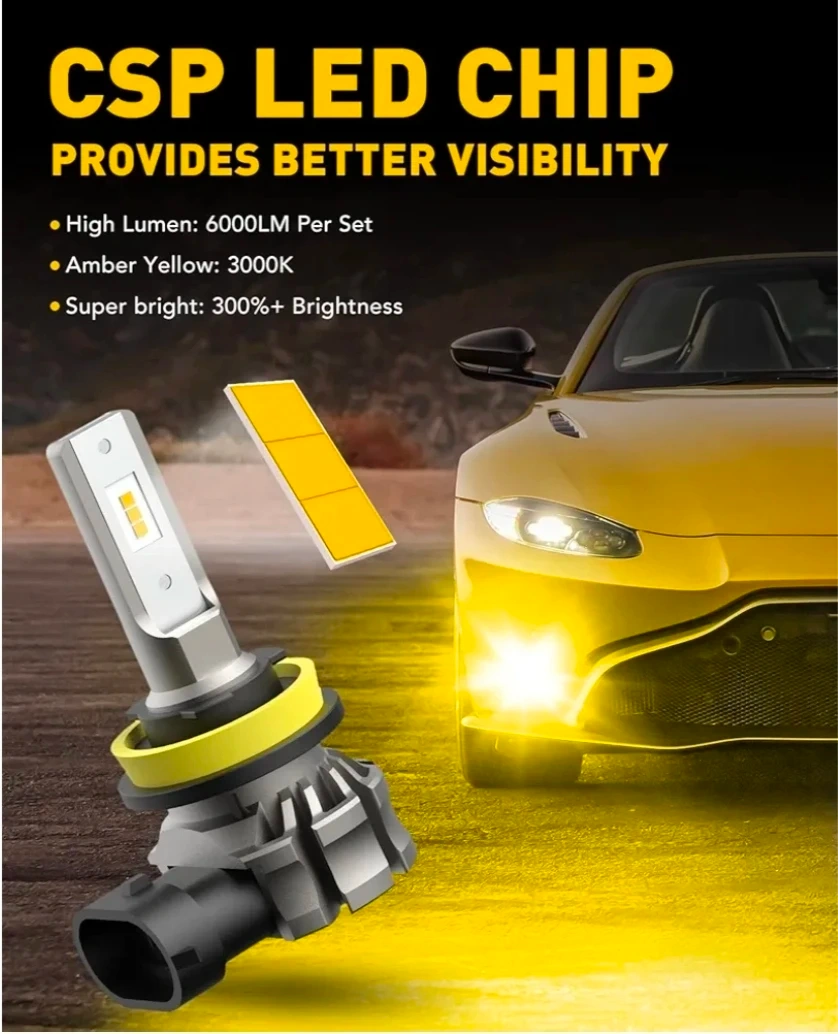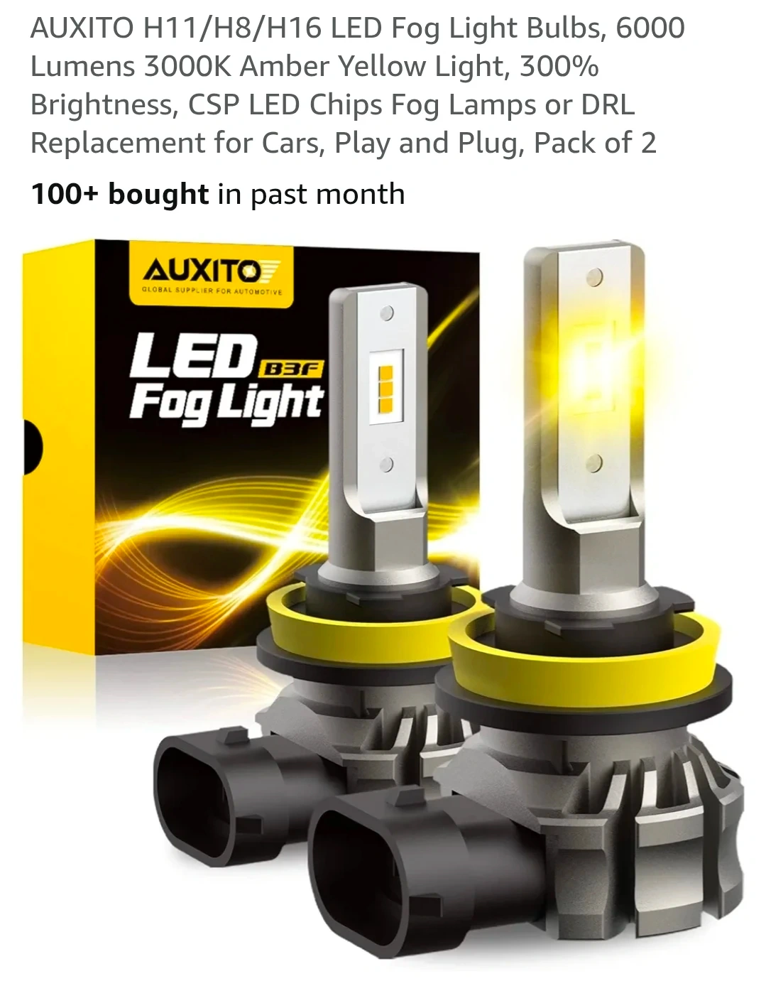 Selling a brand new pair of AUXITO H11/H8/H16 LED Fog Light Bulbs. These bulbs feature CSP LED chips for 300% brightness and emit a 3000K amber yellow light. They are designed as a direct replacement for cars, offering a plug-and-play installation. These bulbs have a lifespan of 30,000 hours and an aviation-grade aluminum body for efficient heat dissipation. They also adapt to extreme weather with IP65 protection, ensuring clear visibility in snowy, rainy, windy, and foggy conditions