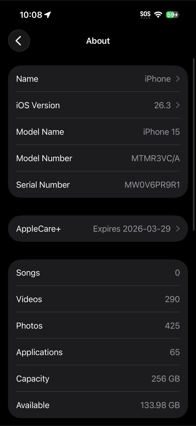 • AppleCare+: Active, expires March 29, 2026