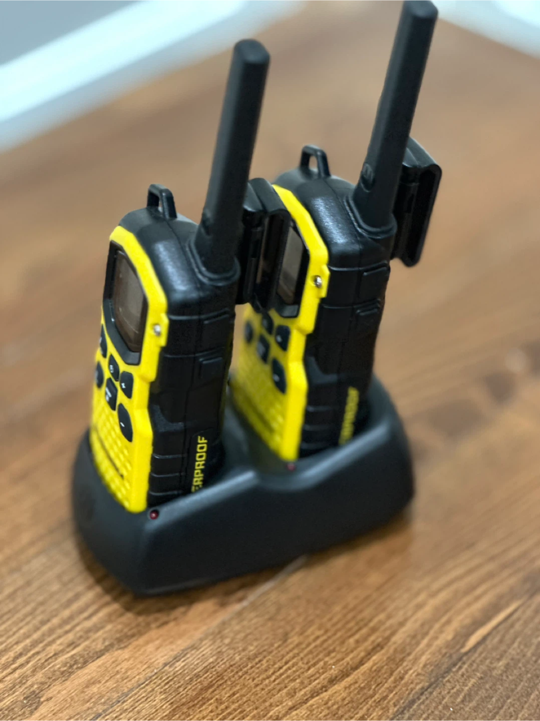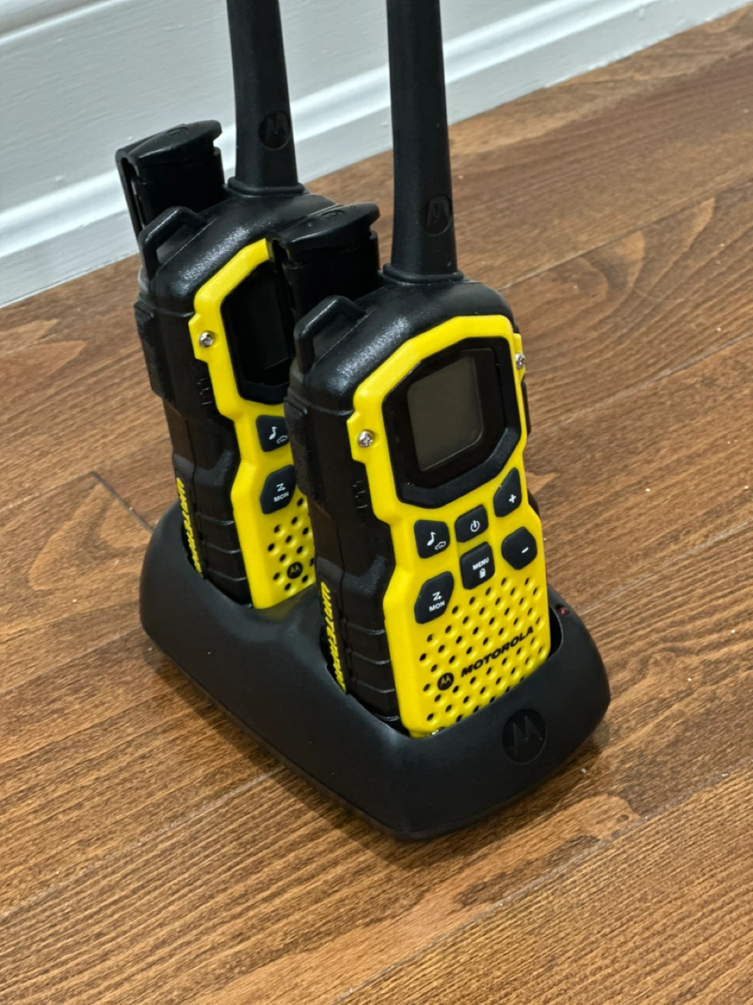Selling a pair of Motorola Waterproof two-way radios in yellow and black. They come with a charging base and power adapter. Perfect for outdoor adventures or keeping in touch during emergencies!