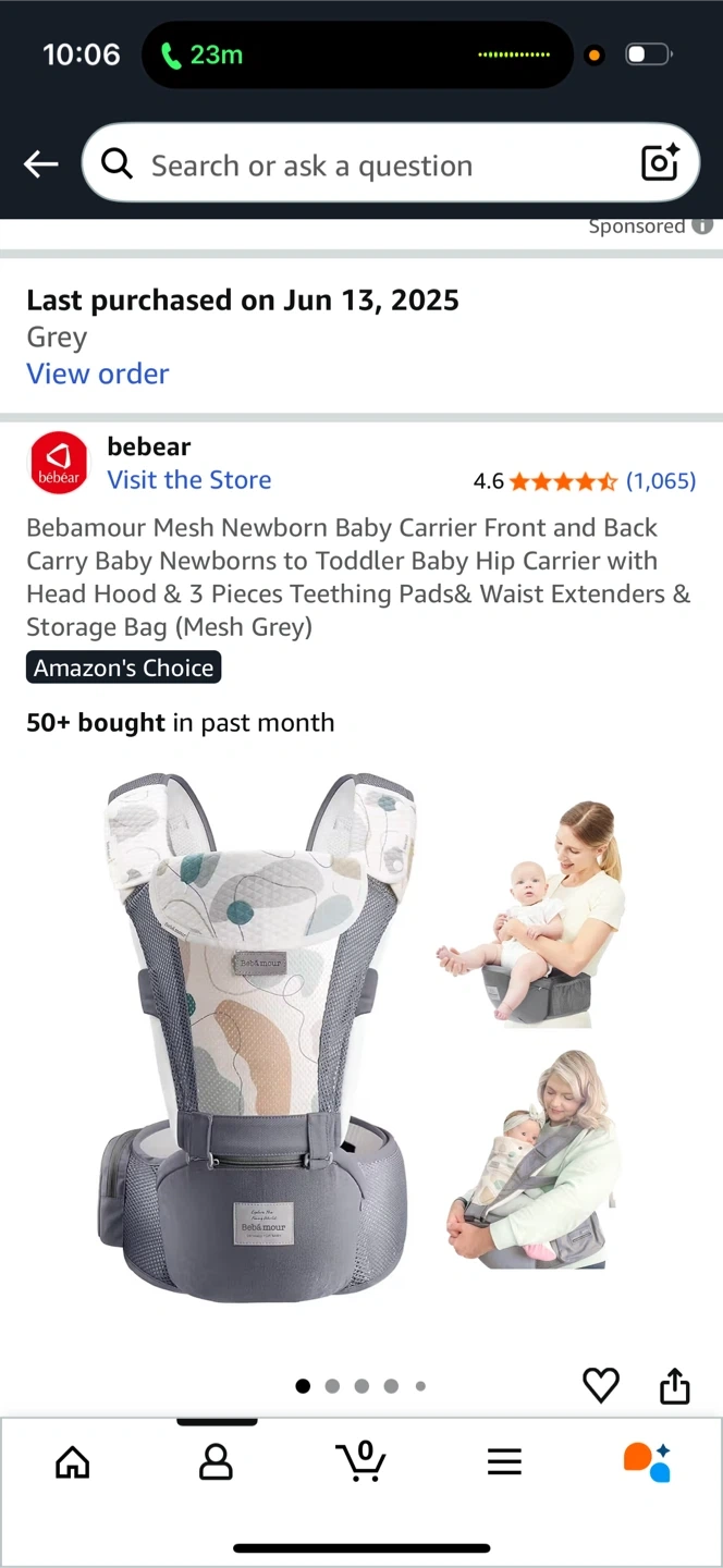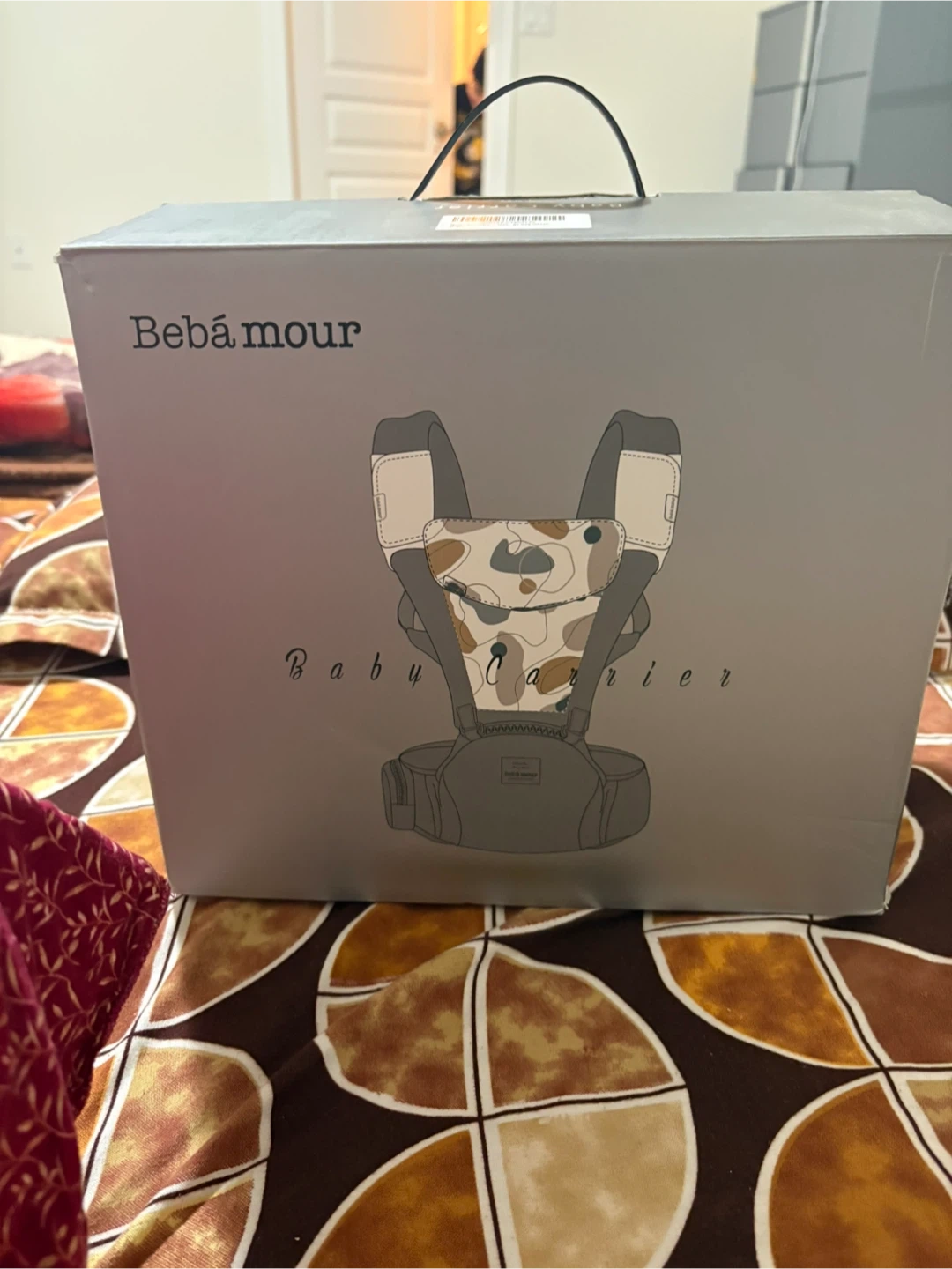 Selling a Bebamour mesh newborn baby carrier in grey. It's in great condition and comes with the original box. This carrier is perfect for newborns to toddlers and can be used in the front or back. It also includes a head hood, 2 teething pads, and waist extenders with a storage bag.