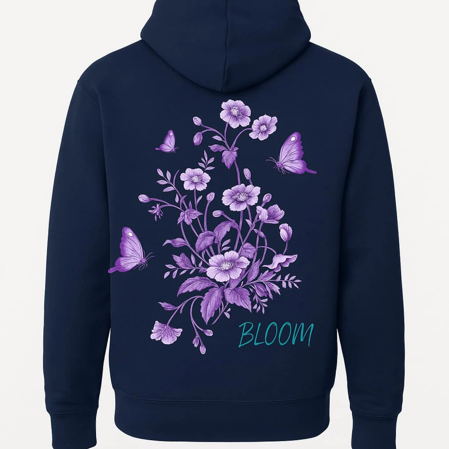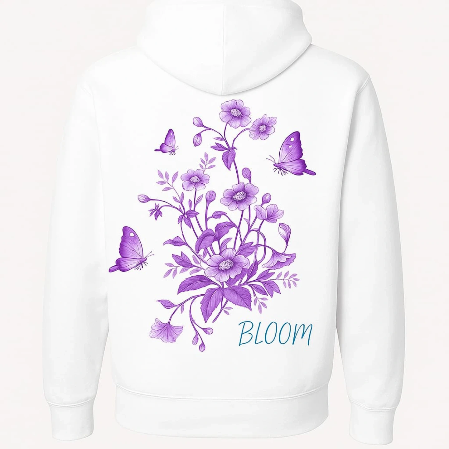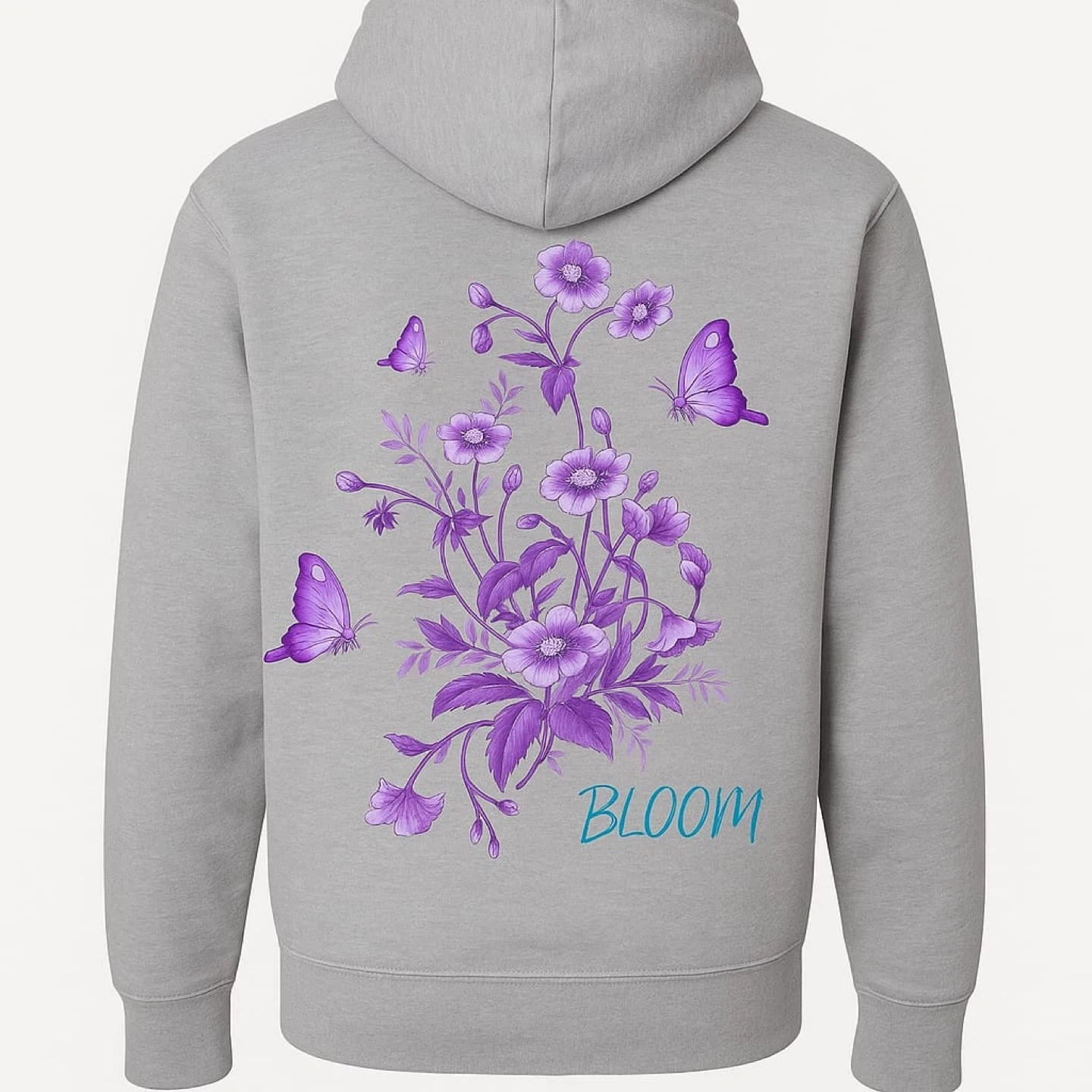 Cozy hoodie with a lovely bloom print on the back! Comes in black, white, grey, dark blue, and black. Perfect for adding a touch of nature to your wardrobe