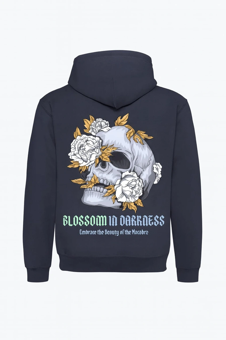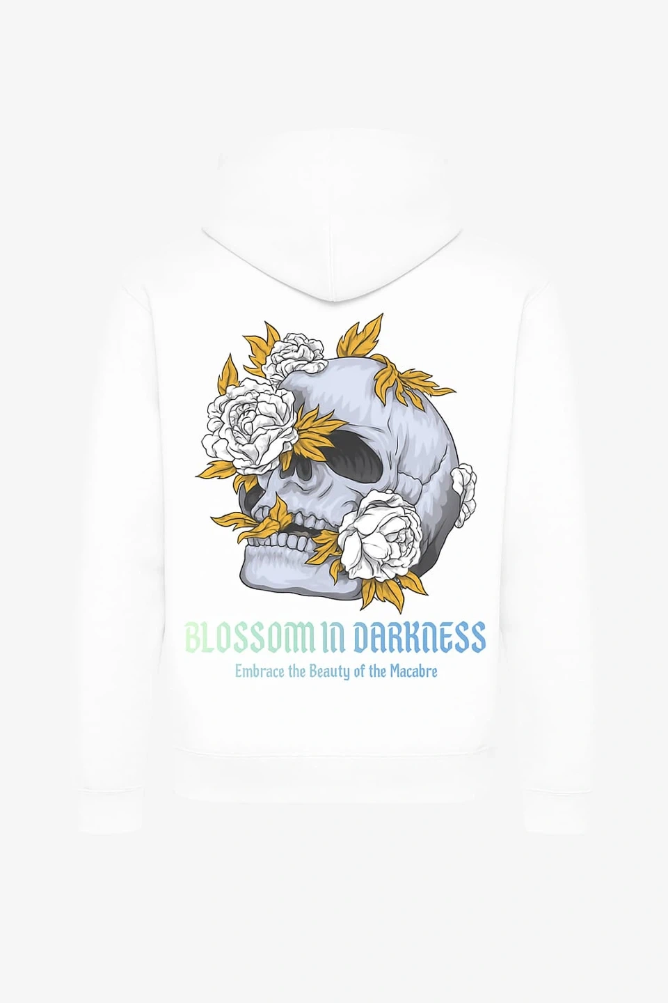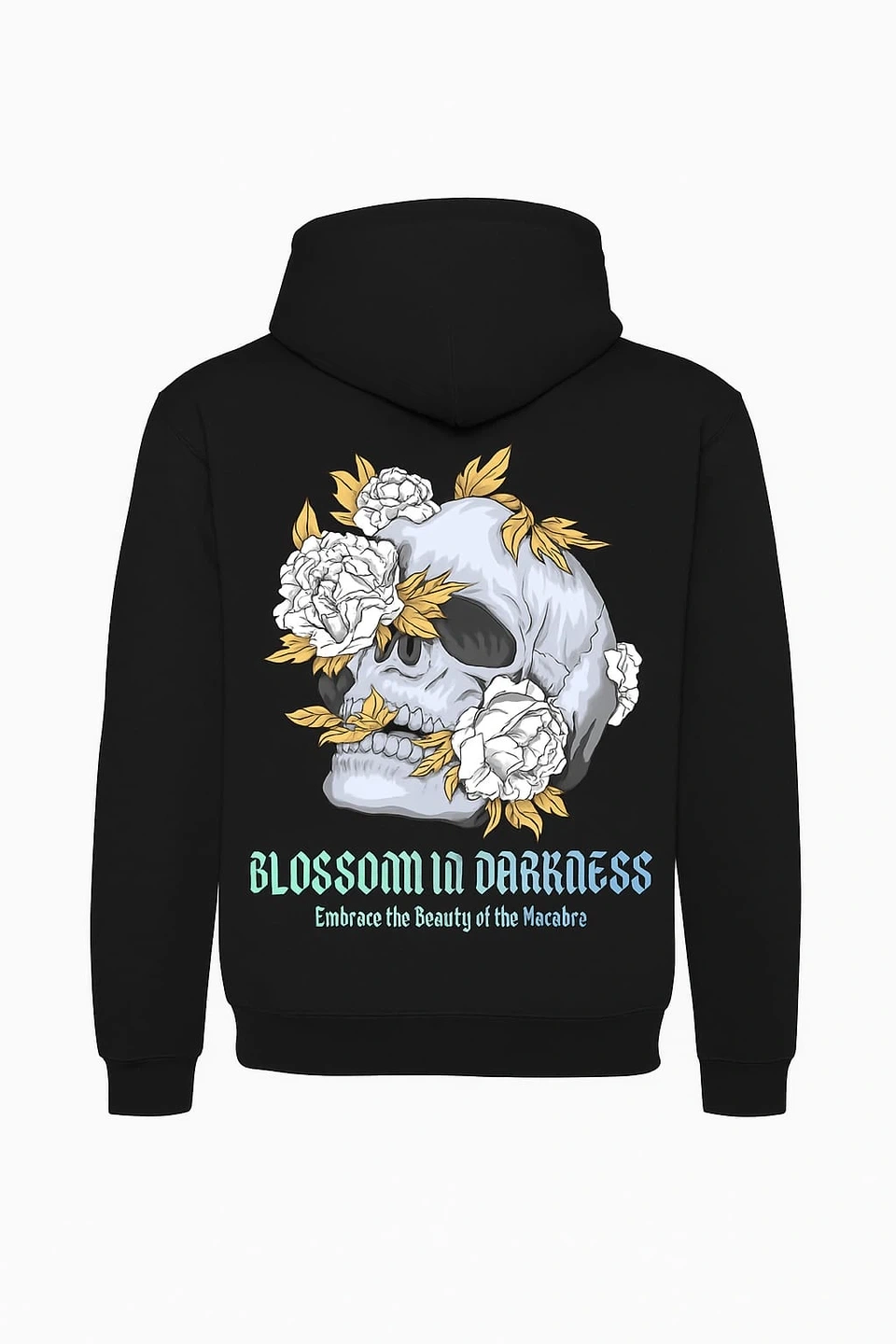 I'm selling a hoodie with a unique design featuring a skull and floral elements, with the words 'Blossom In Darkness' and 'Embrace the Beauty of the Macabre' printed on the back. It's a stylish and eye-catching piece!