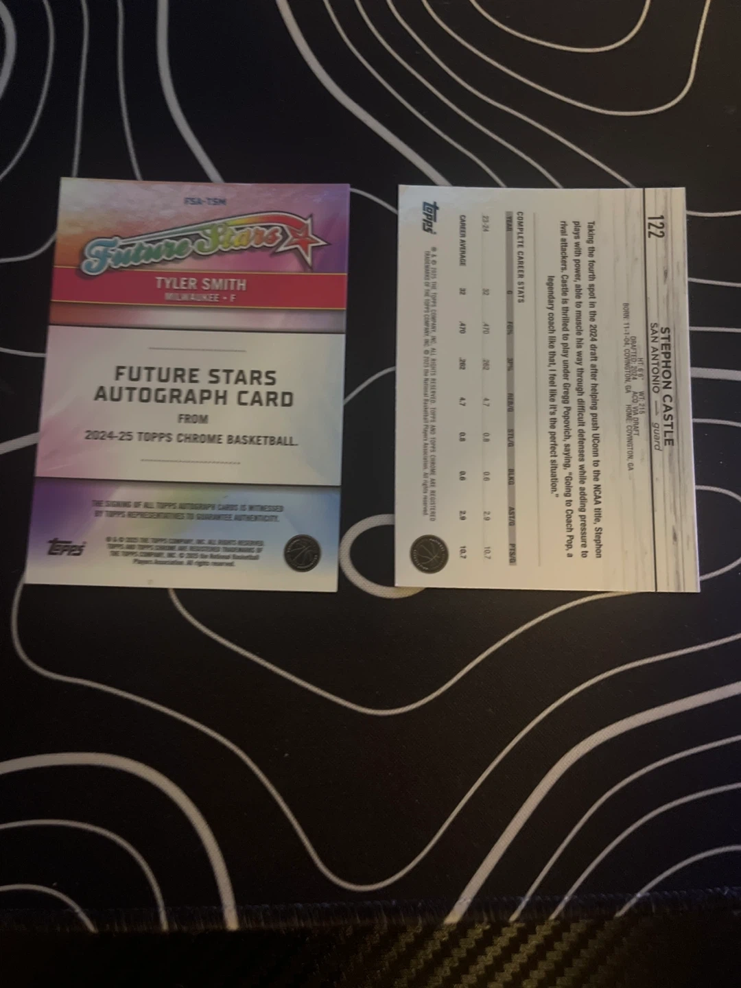 Selling two Topps Chrome basketball cards featuring Tyler Smith and Stephon Castle! The Tyler Smith card is a Future Stars autograph card from the 2024-25 Topps Chrome Basketball series. Both cards are in great condition and would be a great addition to any collection