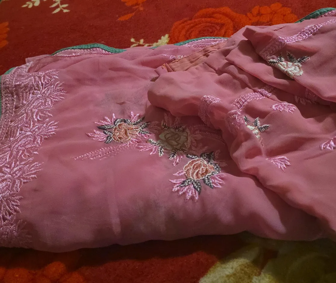 Selling a beautiful pink saree with delicate embroidery. The fabric is lightweight and comfortable, perfect for any special occasion. It has some signs of use.