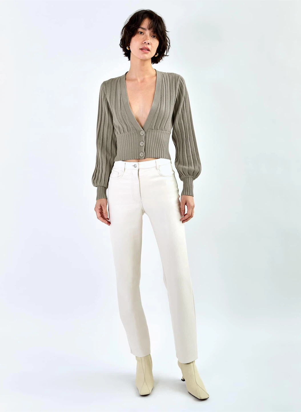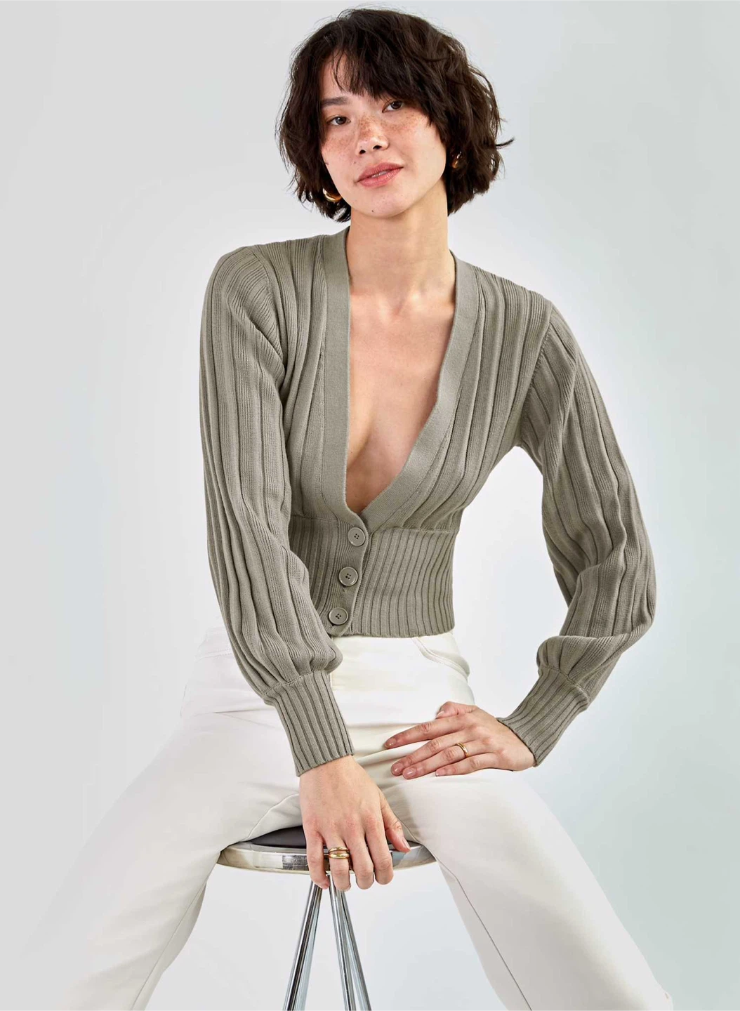 A plunge that always works out. This is a fully fashioned cardigan with a plunging V neckline. It's knit with Breeze Merino — extra-fine merino wool and cotton yarn with lightweight, all-season warmth and a soft feel. It's constructed using a Double Knit stitch for structure and a flat, dense feel.