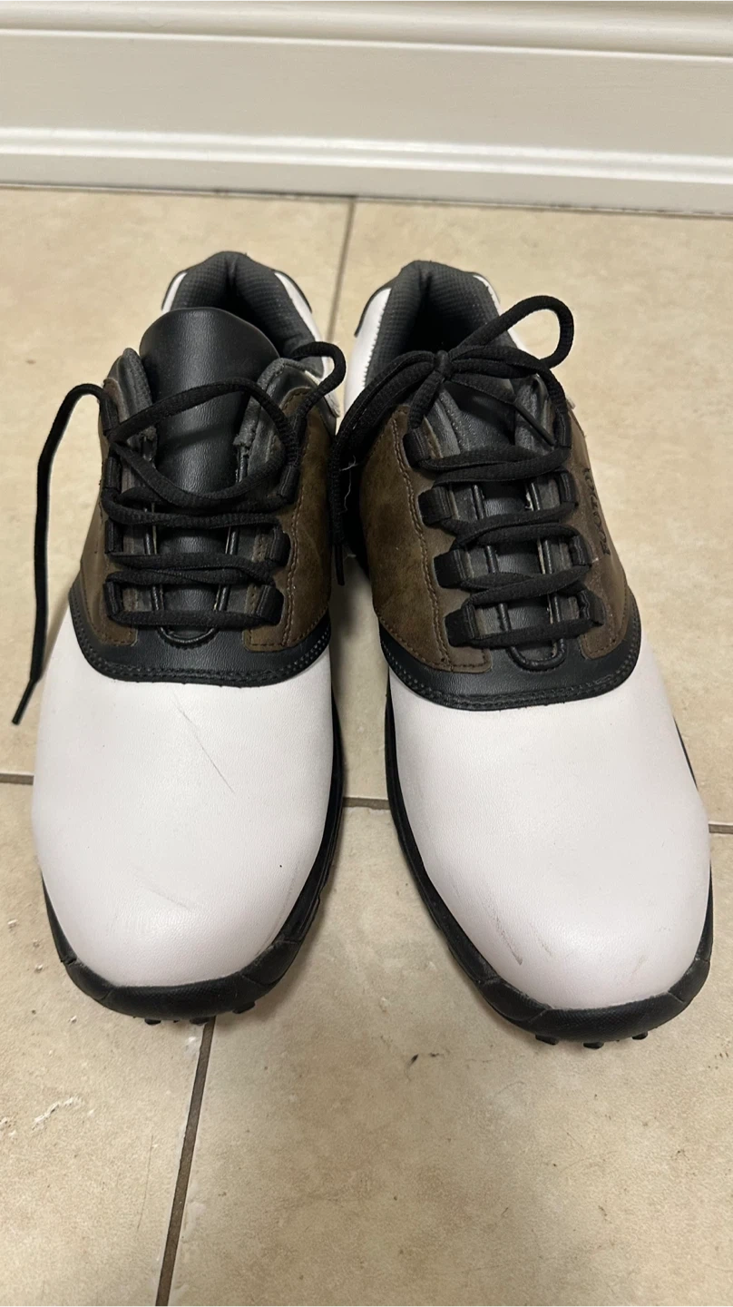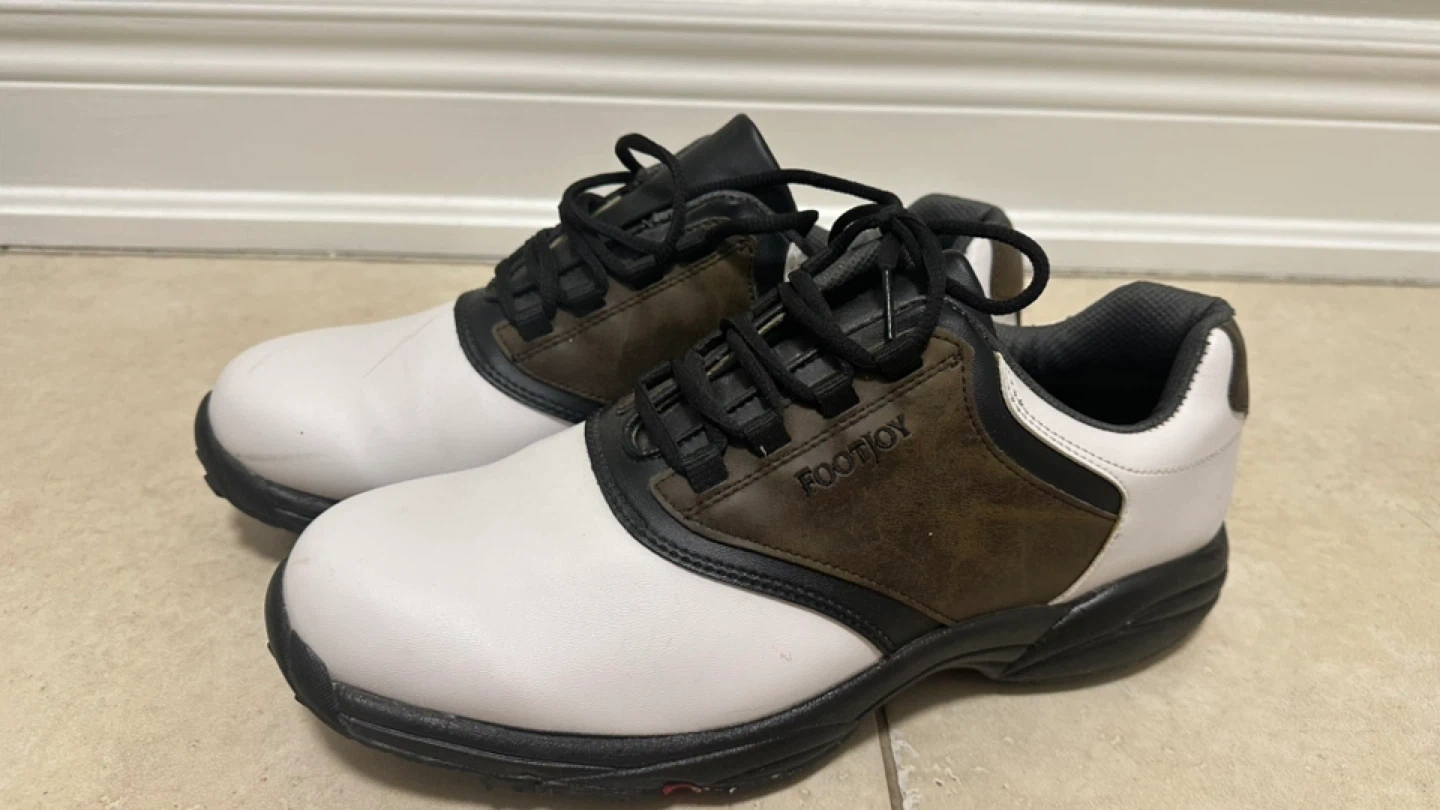 Selling a pair of Leather FootJoy golf shoes in white and brown. They are in good condition for hitting the links!