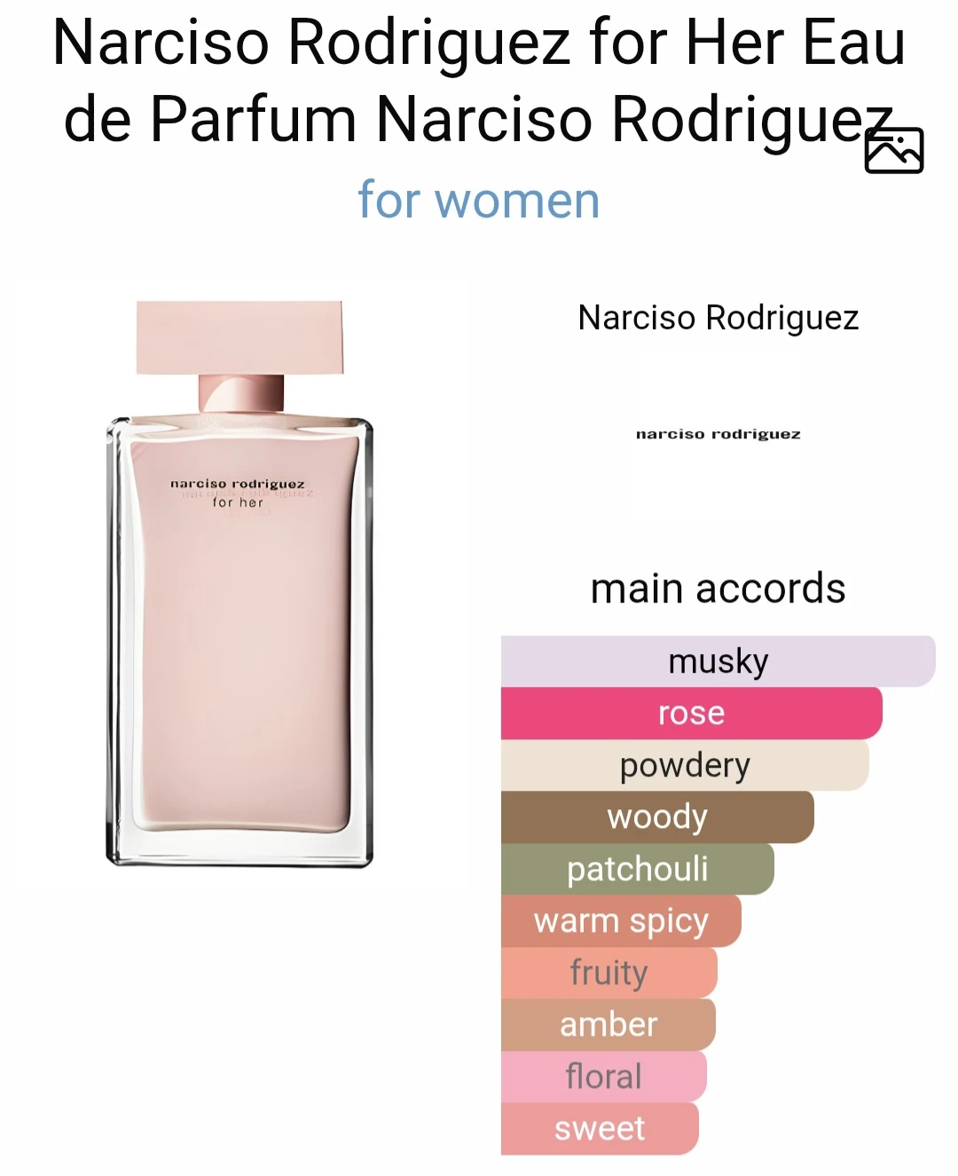 Selling a bottle of Narciso Rodriguez for Her Eau de Parfum. It's a lovely fragrance with main accords of musky, rose, and powdery notes. It also has woody, patchouli, warm spicy, fruity, amber, floral, and sweet hints.