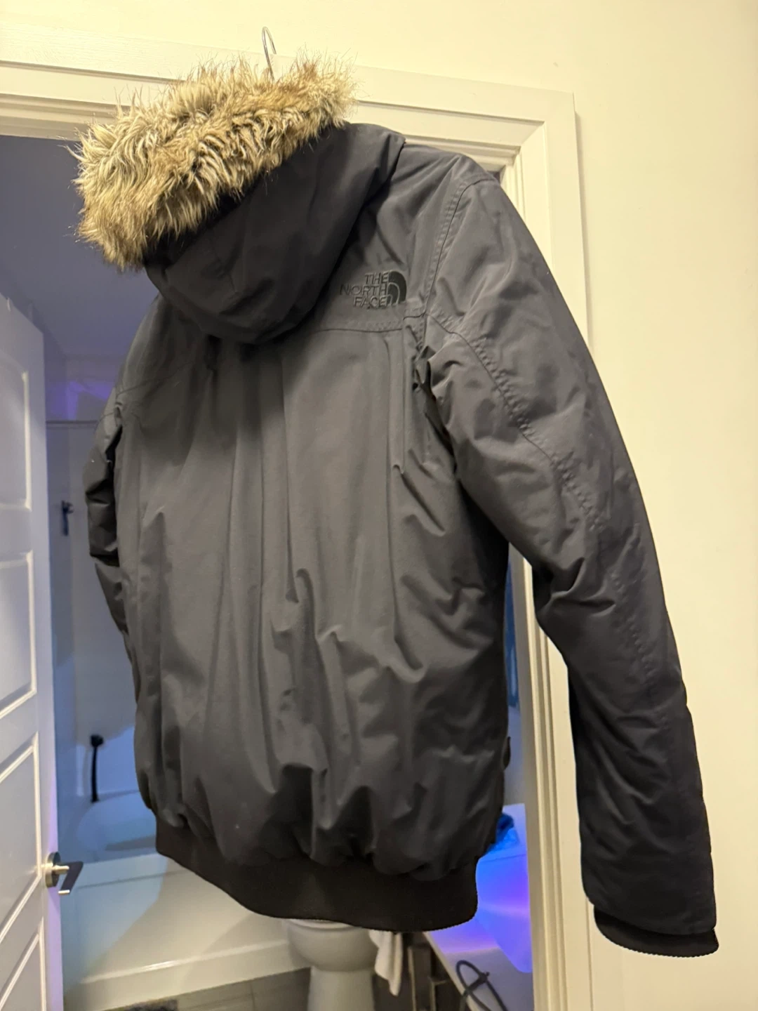 The North Face men's jacket in size Medium. It's in great condition and perfect for staying warm this winter. The jacket features a fur-trimmed hood and multiple pockets. It's a stylish and functional choice for braving the cold Canadian weather!