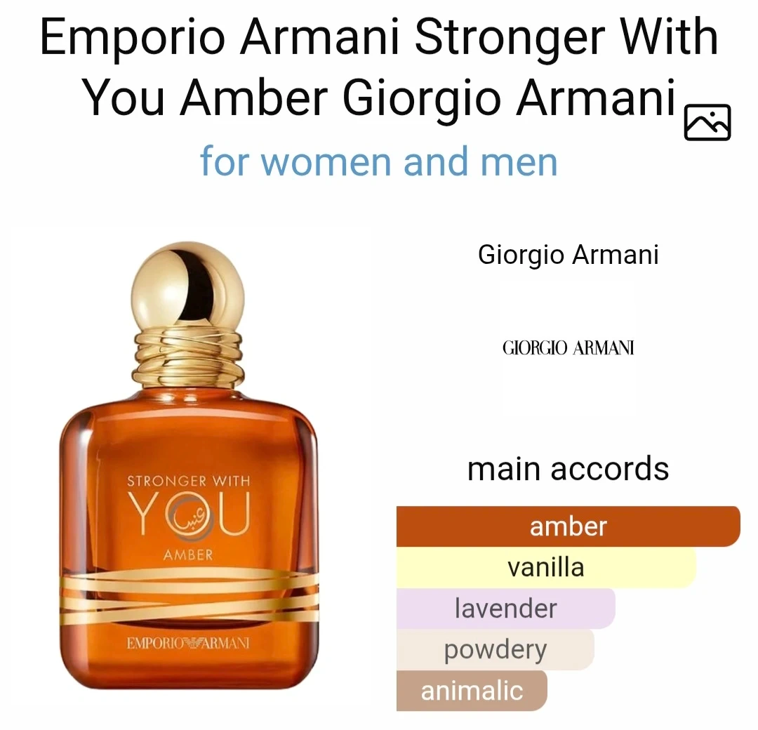 Selling a 100mL bottle of Emporio Armani's Stronger With You Amber perfume! This fragrance has main accords of amber, vanilla, lavender, powdery, and animalic notes.
