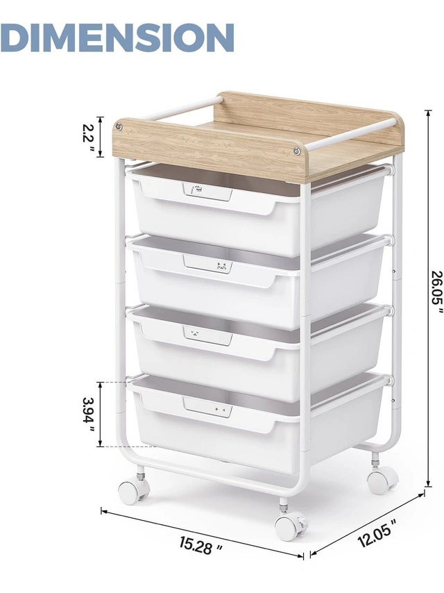 This brand new, four-drawer rolling utility cart features a stylish wooden top and handy design, perfect for organizing any space! The cart provides ample storage with its four drawers and easy mobility with its rolling wheels. Here are some details: