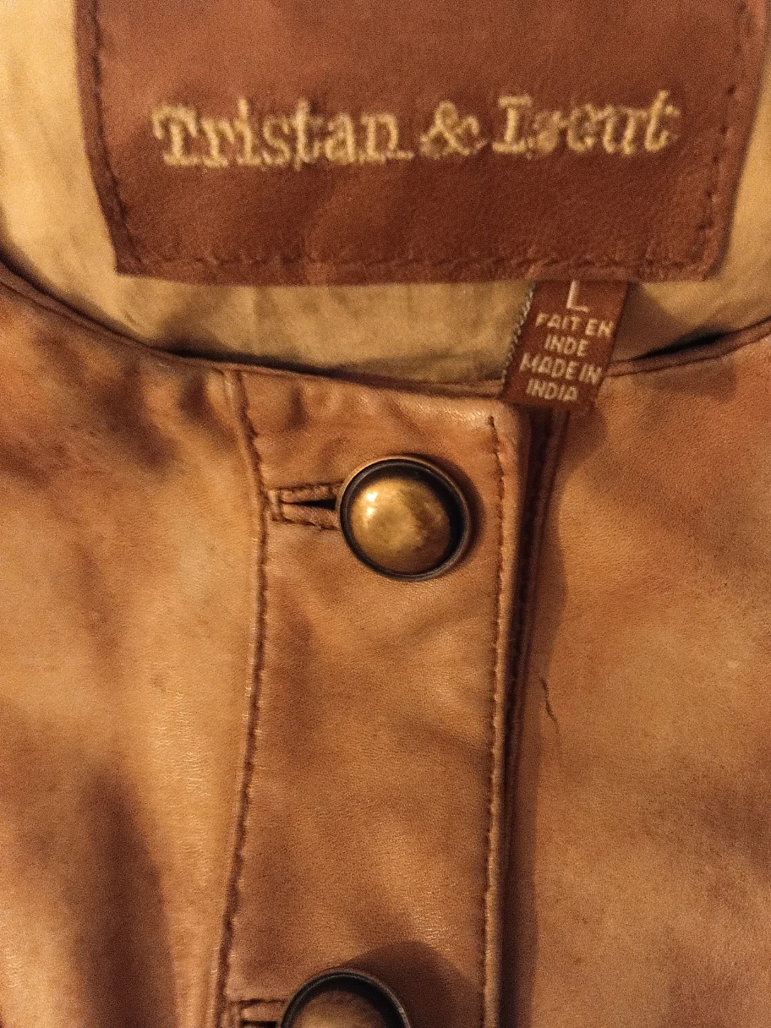 I'm selling a Tristan & Iseut leather jacket in size L. It's a stylish jacket with a unique design, perfect for adding a touch of sophistication to your wardrobe. Made in India
