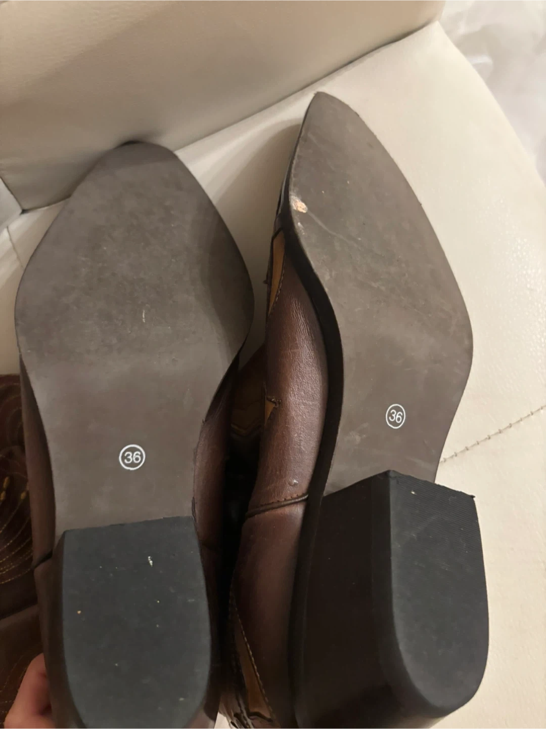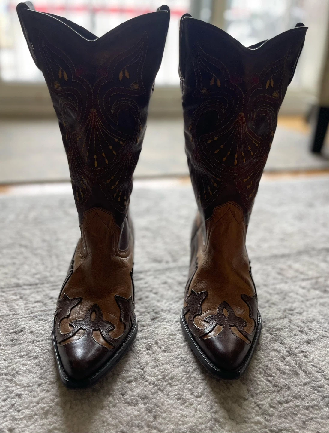 Selling a pair of stylish brown leather cowboy boots! They are a size 6 and feature a classic design with decorative stitching. Perfect for adding a touch of western flair to any outfit.