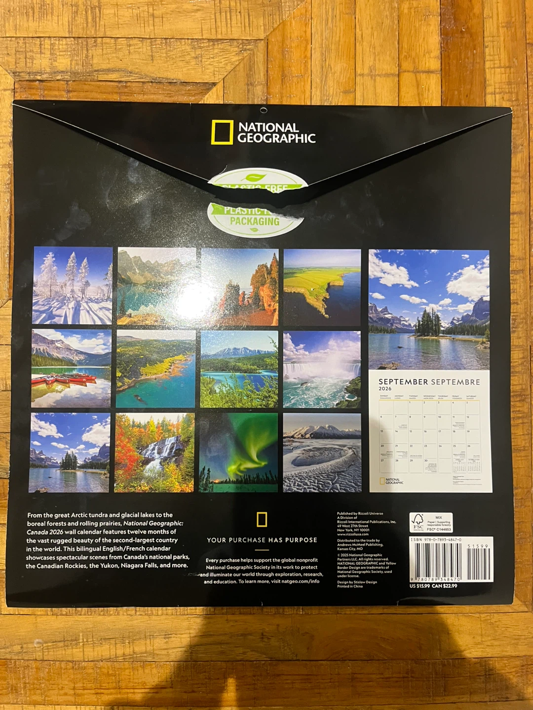 Selling a National Geographic 2026 calendar featuring Canada! It's brand new and still in its original plastic packaging. The calendar showcases beautiful landscapes from across Canada