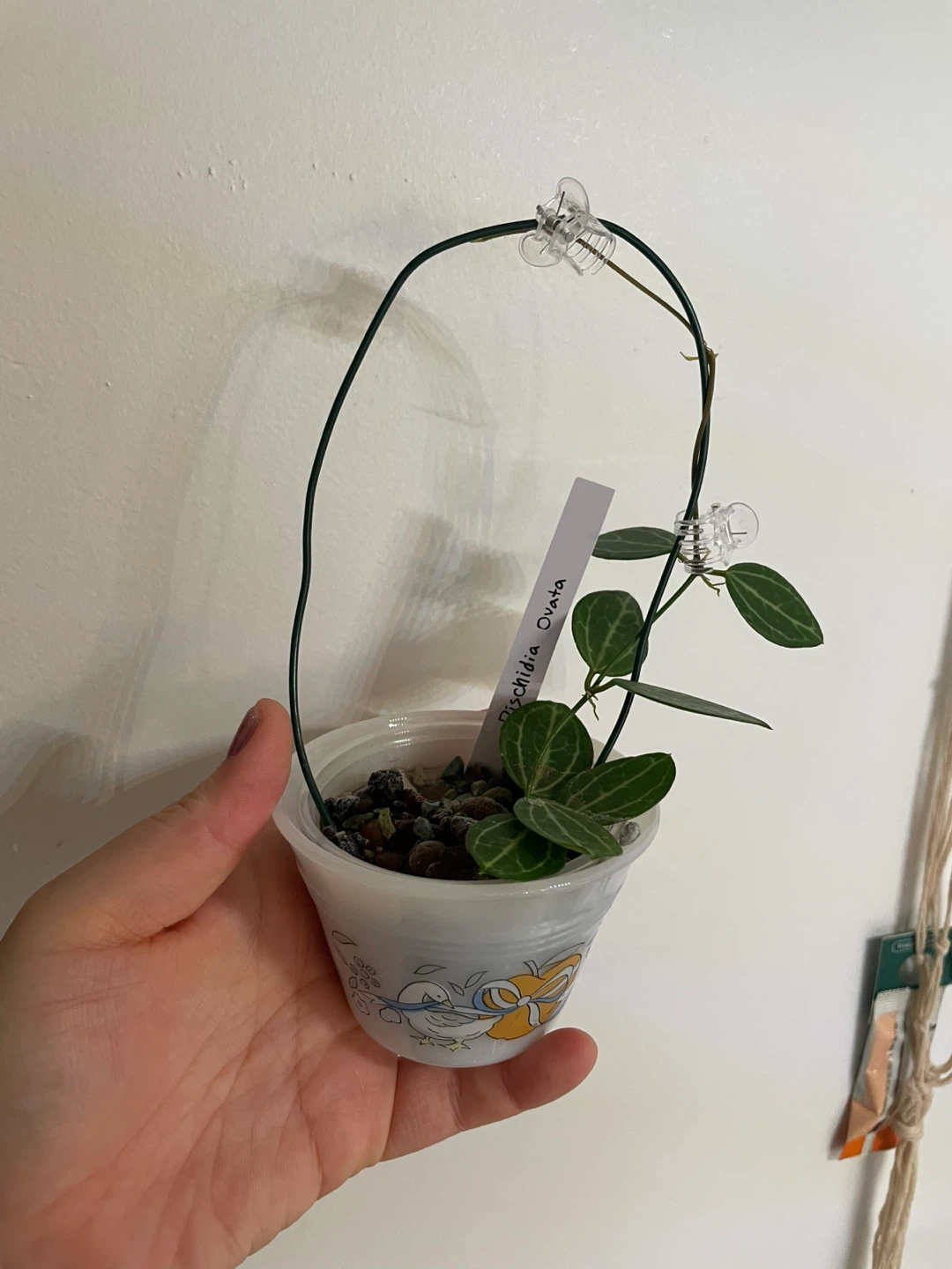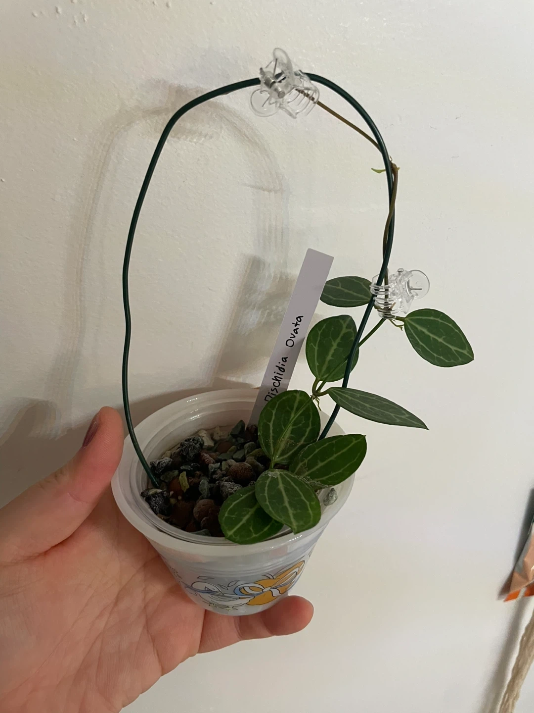 Selling a healthy Dischidia Ovata plant! It's in a small pot and has a wire support structure to help it grow. A lovely addition to any plant collection