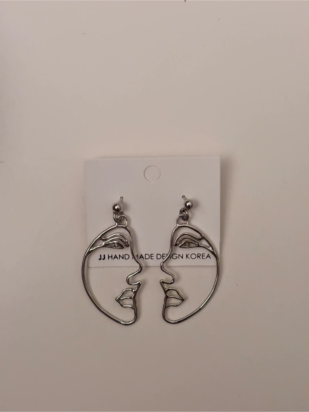 Selling a pair of unique silver-coloured earrings with a face design. They are handmade in Korea and would be a great addition to any jewelry collection!