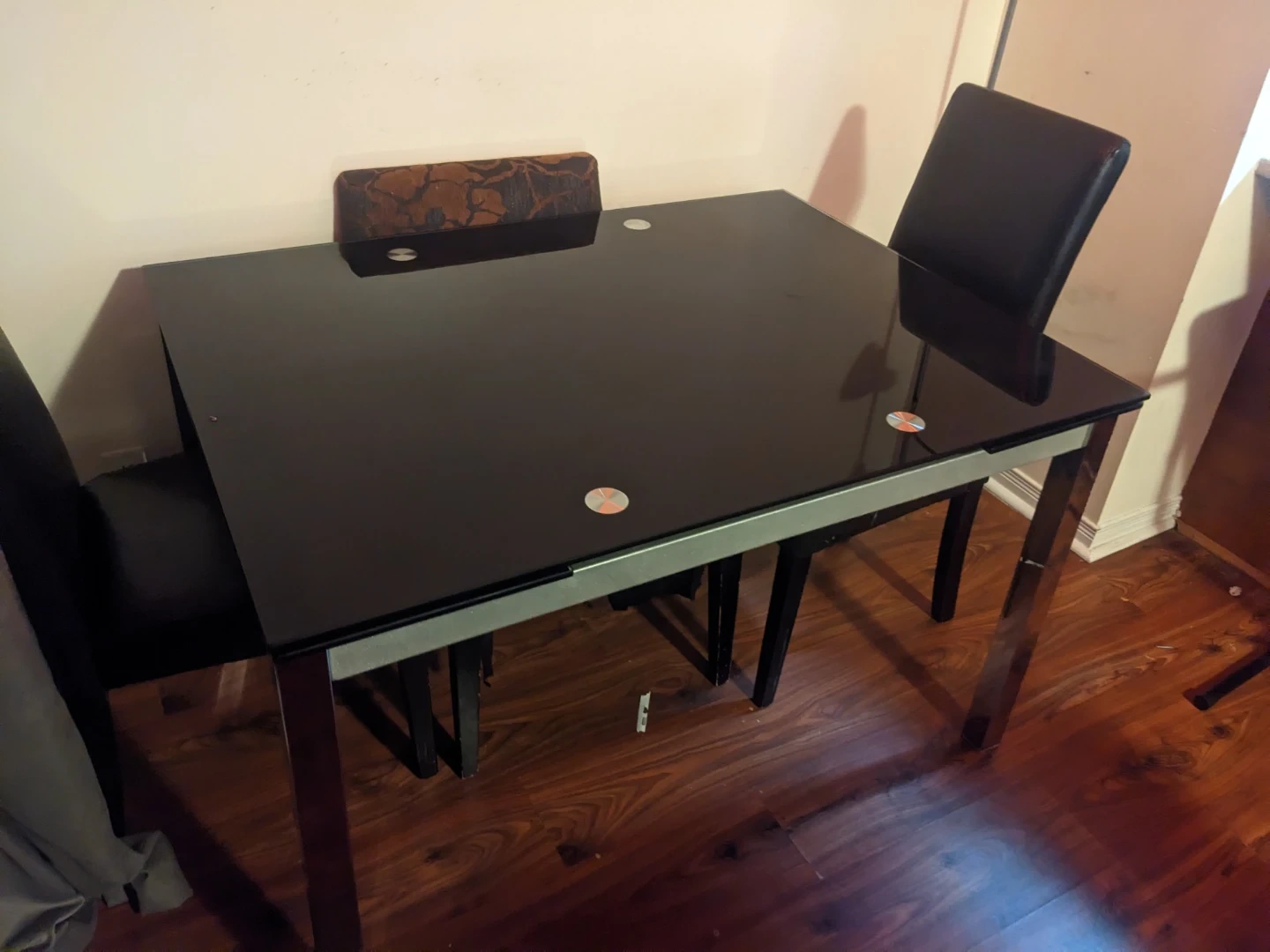 Selling a dining table with two chairs. The table features a black glass top and chrome legs. The chairs are black with a leather-like material. Perfect for a small dining area or apartment!