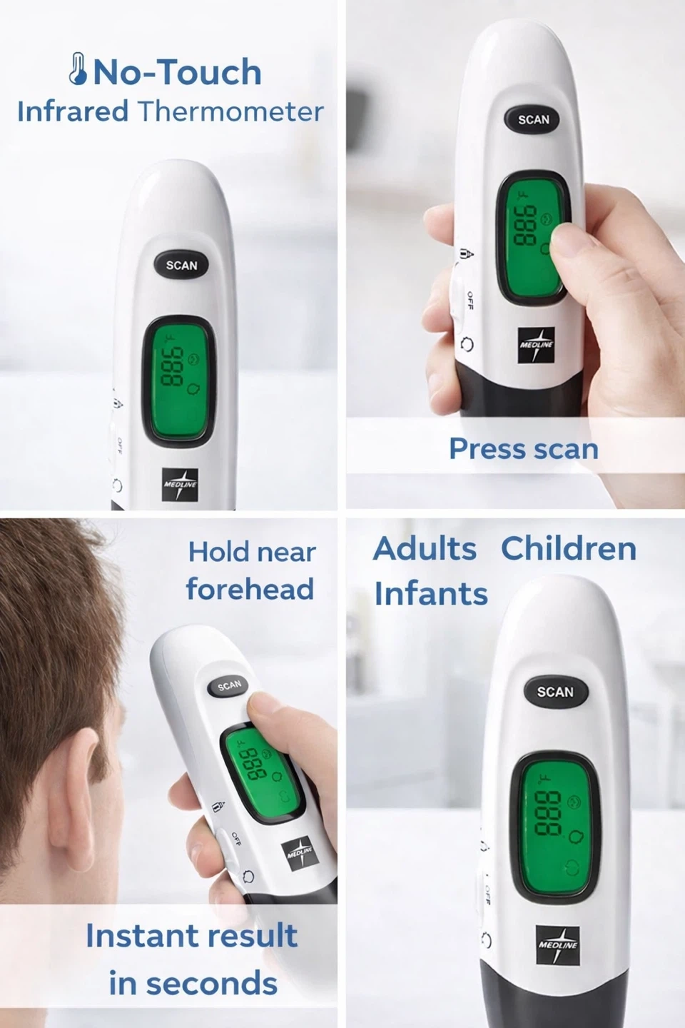 Get instant temperature readings with this Medline No-Touch Infrared Thermometer! It's super easy to use β just hold it near the forehead and press scan for a result in seconds. Perfect for adults, children, and infants