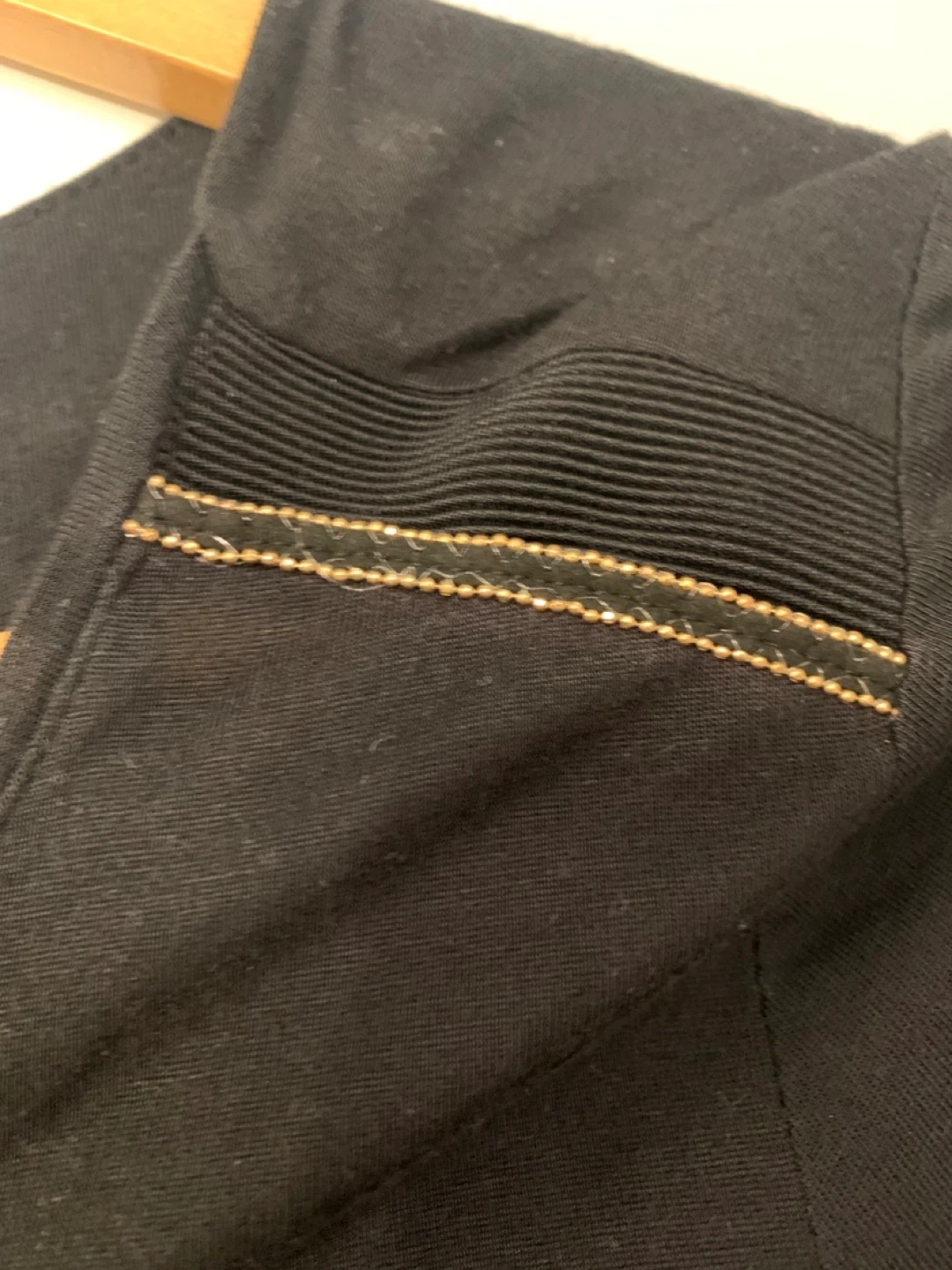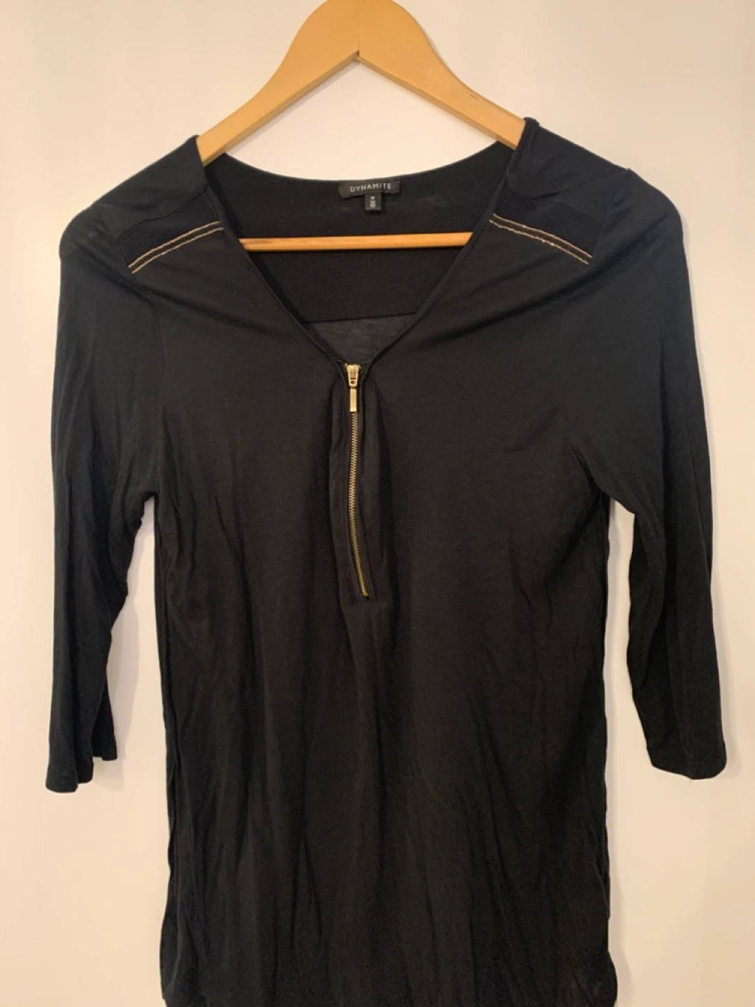 Selling a Dynamite black top in size medium. It features a stylish zipper and some decorative detailing on the shoulders. Perfect for a night out!