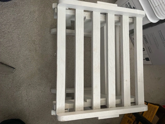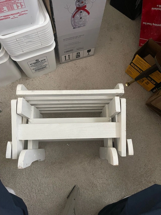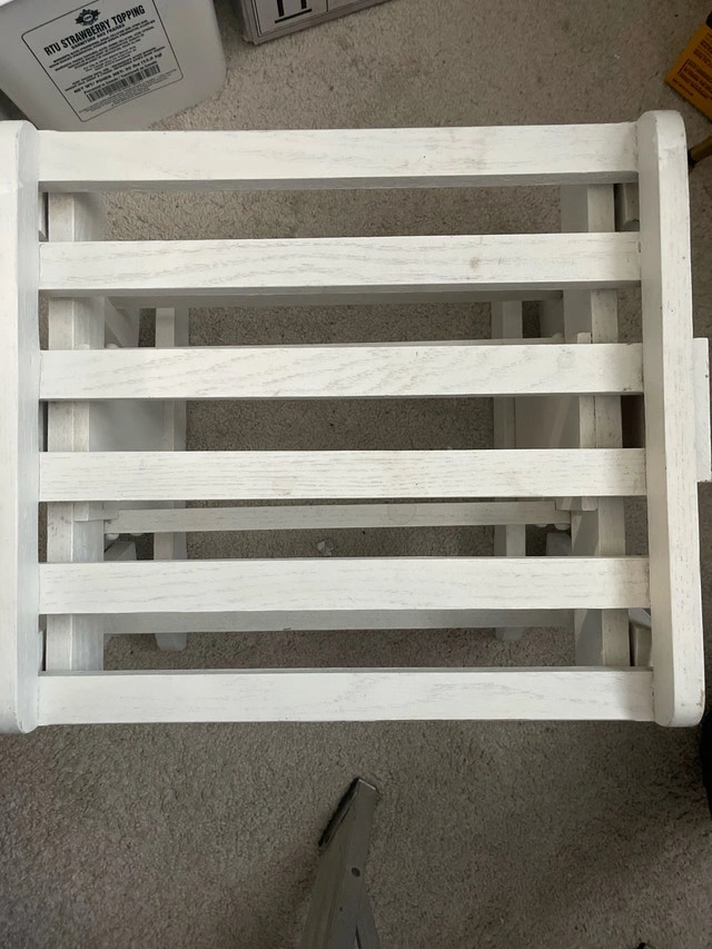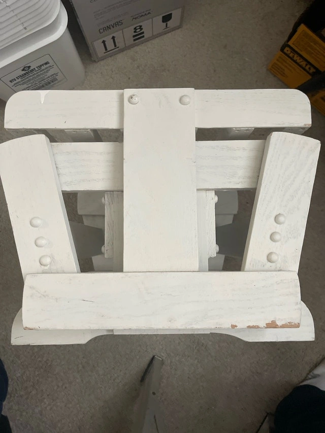 This charming white wooden FOOTREST is perfect for RELAXING with Your Wooden Rocker !!! OR!! ……. Put a couple screws or zip ties and it can use it as an END TABLE for YOUR PADIO SET !!! I am hoping to find a new home for this piece. Pick up WINDSOR Park !
