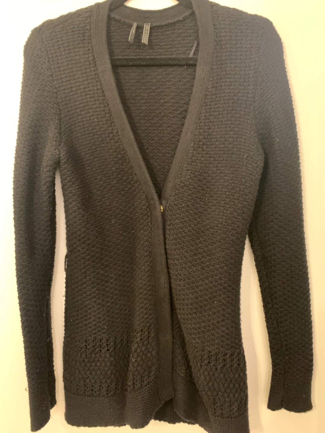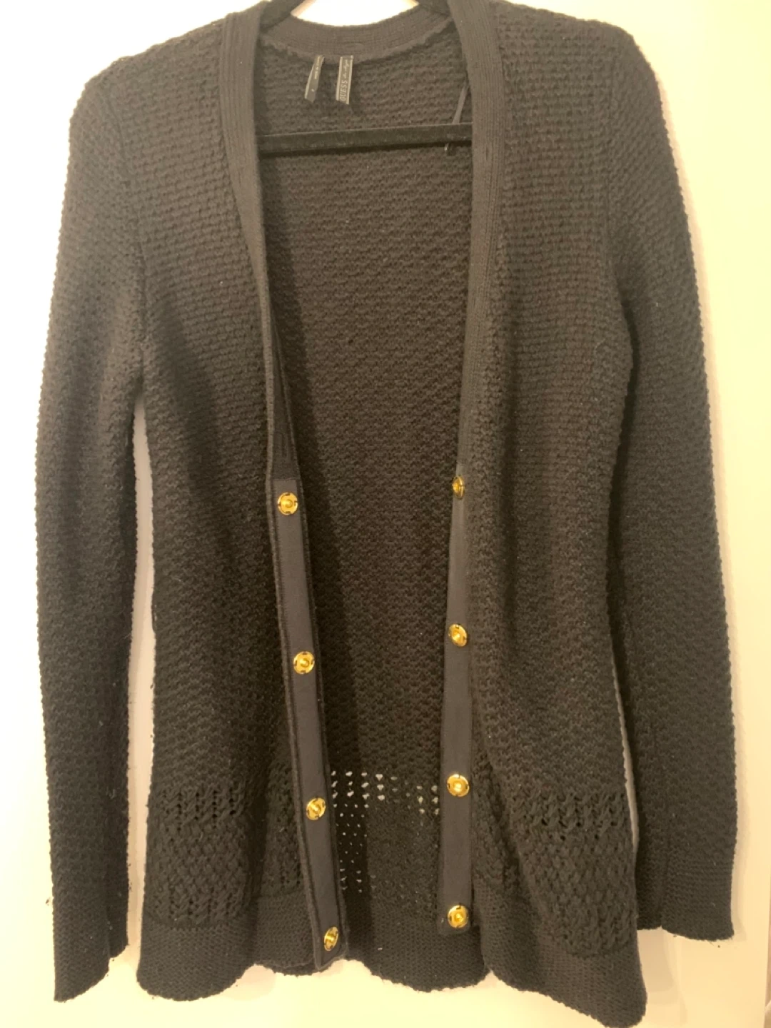 Selling a Guess Los Angeles cardigan in black. It's a size M and in great condition! The material is soft and comfortable, perfect for layering