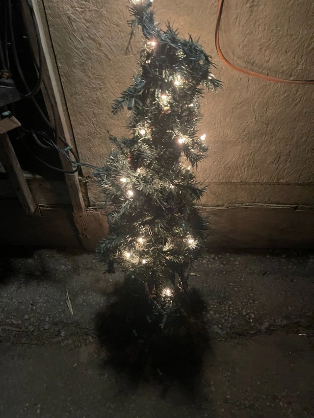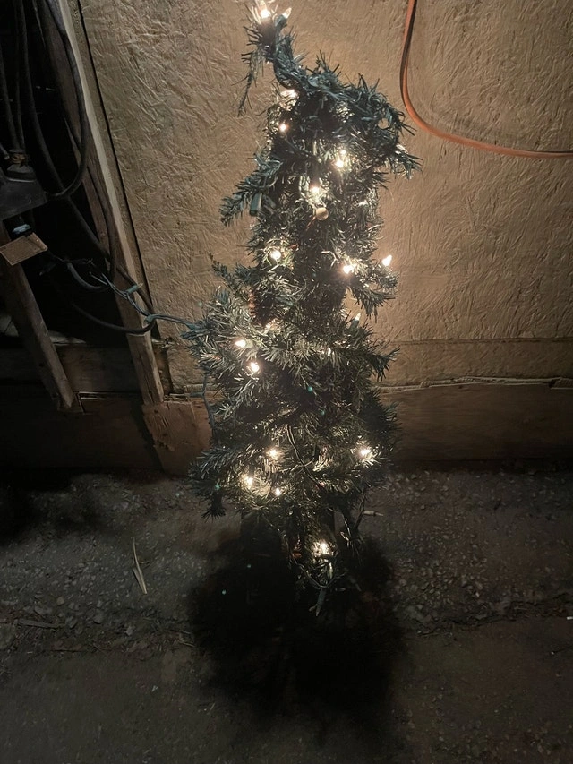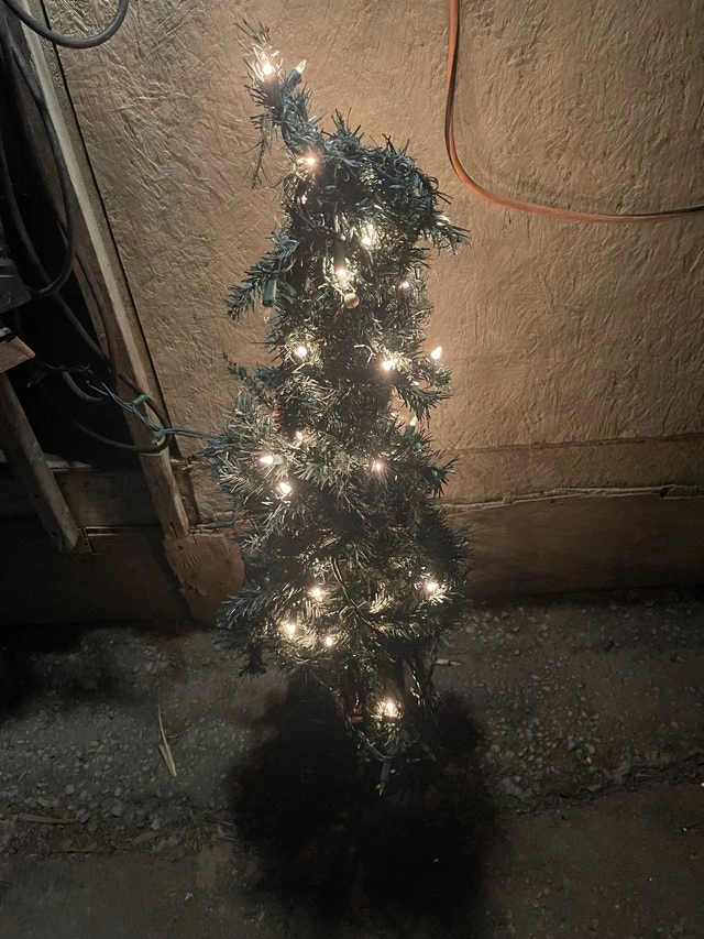 Brighten up a small space with this festive, pre-lit Christmas tree. This charming little tree is ready to add holiday cheer to any corner of your home. About 30” tall, perfect for each side of your front door! This used Christmas tree is in fair condition. It comes pre-lit with warm white lights. Set of two doorway greeters… cute! One lights up; the other may need a bulb. They just came out of storage and were working before, so it may just be a loose bulb. Wreath also… check other listings!