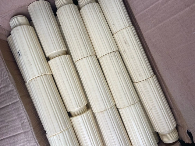 CALLING ALL CRAFTERS !!!!!!! But they are a great project item for the creative minds out there ! There are about sixty pieces they are a hard plastic and all beautiful threaded so You can make them the length You want they are aprox 4 inches long (each piece ) So you have 60X 4 =244 “ (failed maths ? ). …. (I think there is actually 61 pcs. ) !!!! I'm offering a set of fluted lamp pipe nipples, perfect for various lighting projects or repairs. These are made of durable plastic, each measuring 4 inches in length with threading on either side for easy assembly. Condition is like new out of storage as pictured. * Material: Plastic * Length: 4 inches each section * Threaded on both ends female and male … These lamp pipe nipples are a classic design and have a ribbed texture for a secure grip. They're here, they're ribbed,like bamboo ? Gett ready to build the lamp of your dreams! If the listing is up, the item is available! Make me an offer just hope someone can give them a new purpose … *******