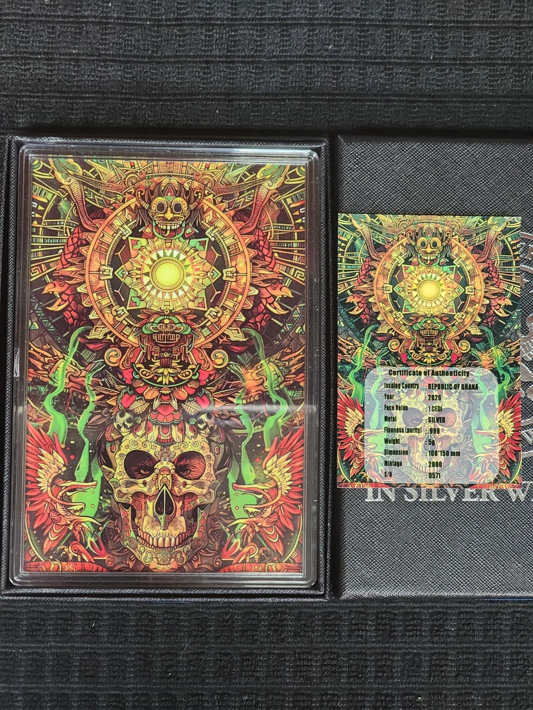 Selling a Republic of Ghana 1 CEDI silver coin featuring an Aztec calendar design. This coin is made of .999 silver and weighs 5 grams. It comes with a certificate of authenticity and is housed in its original box. The mintage is limited to 2000. A great collectible item!