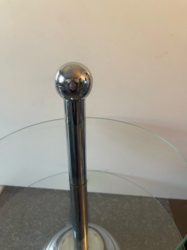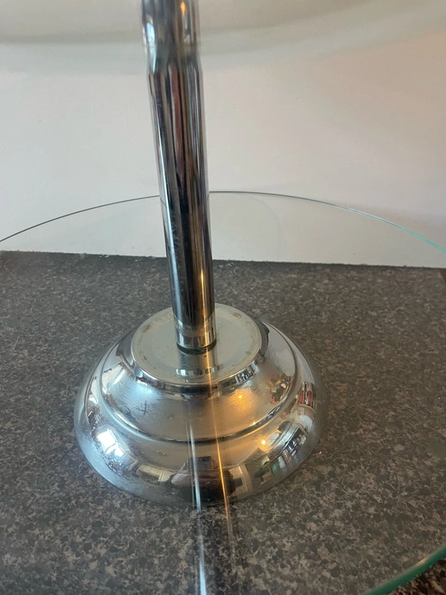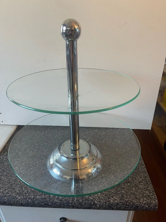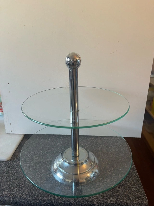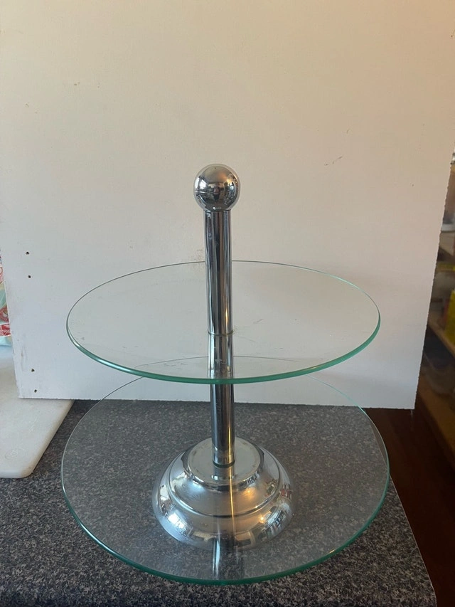 Add a touch of elegance to your table with this used two-tier serving dish, perfect for displaying appetizers, desserts, or hors d'oeuvres. It has a sturdy construction and is still available for purchase.