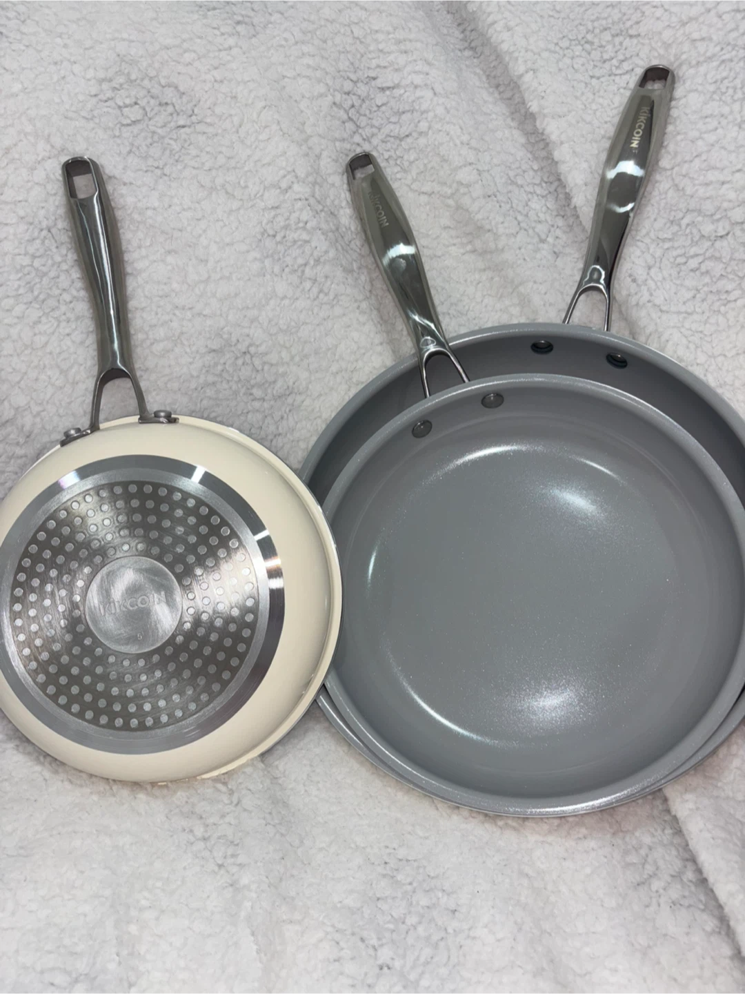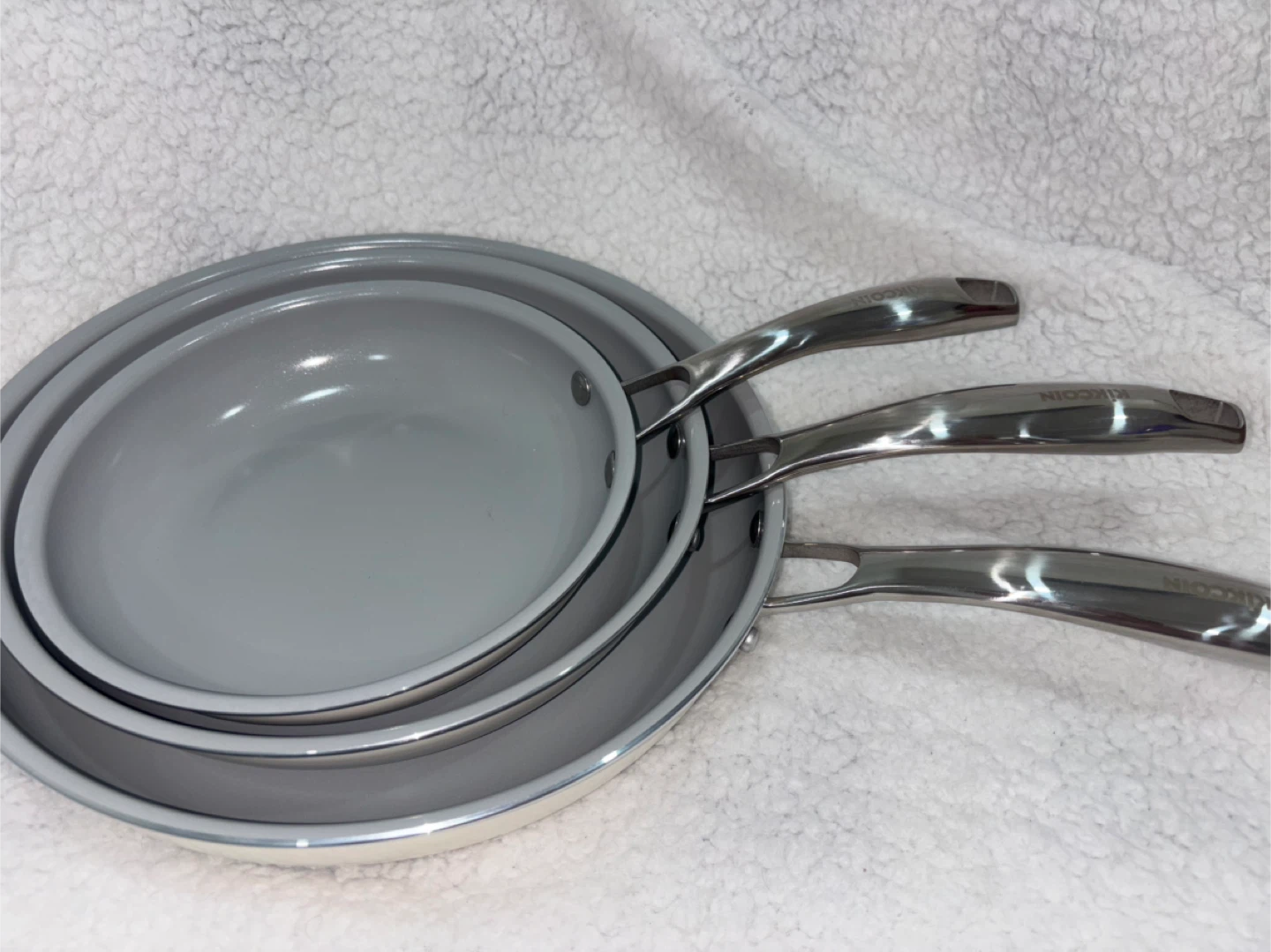Selling a 3-piece frying pan set from kikcoin.These pans are perfect for everyday cooking and are in great condition. They feature a sleek design and durable construction, making them a great addition to any kitchen