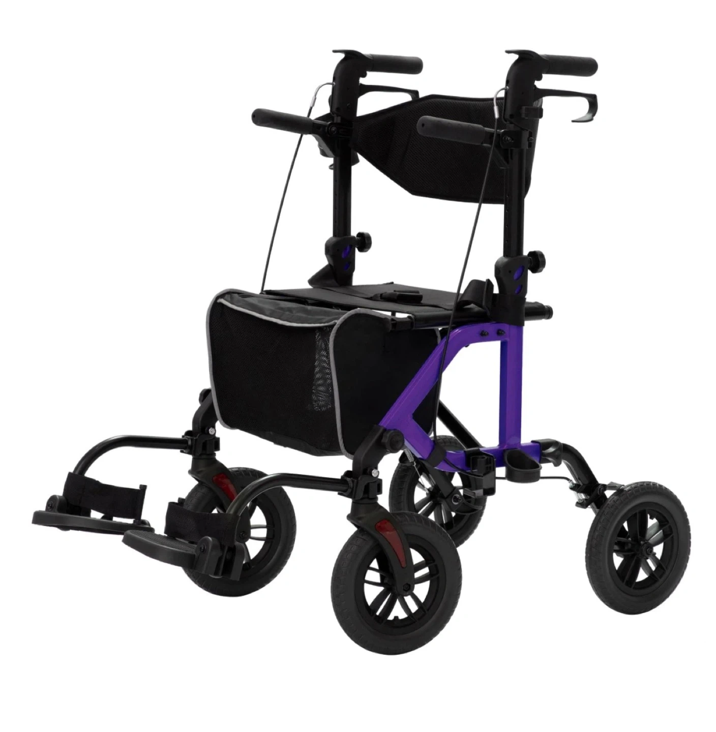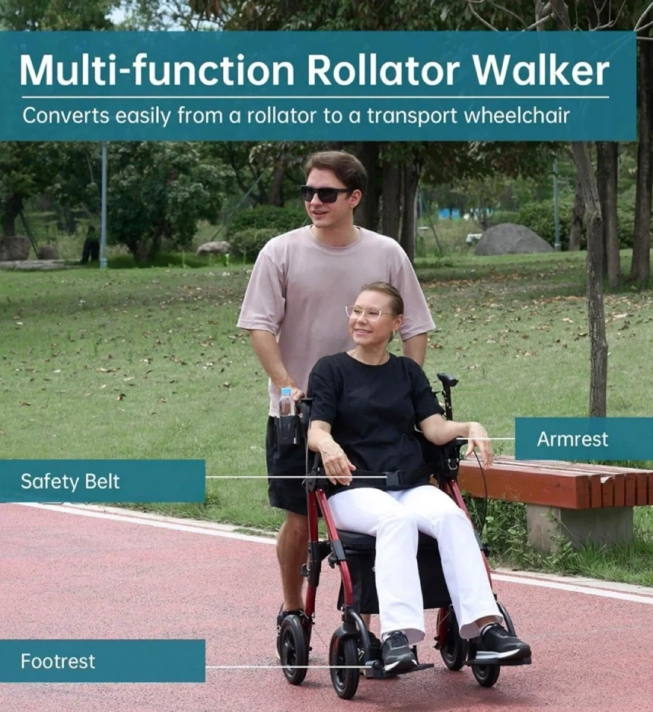 Elenker 2-in-1 Rollator Walker – Versatile rollator and transport chair in one. Features large all-terrain wheels, dual hand brakes, padded seat with backrest and safety belt, and a sturdy foldable frame for easy transport and storage. Ideal for indoor and outdoor use.