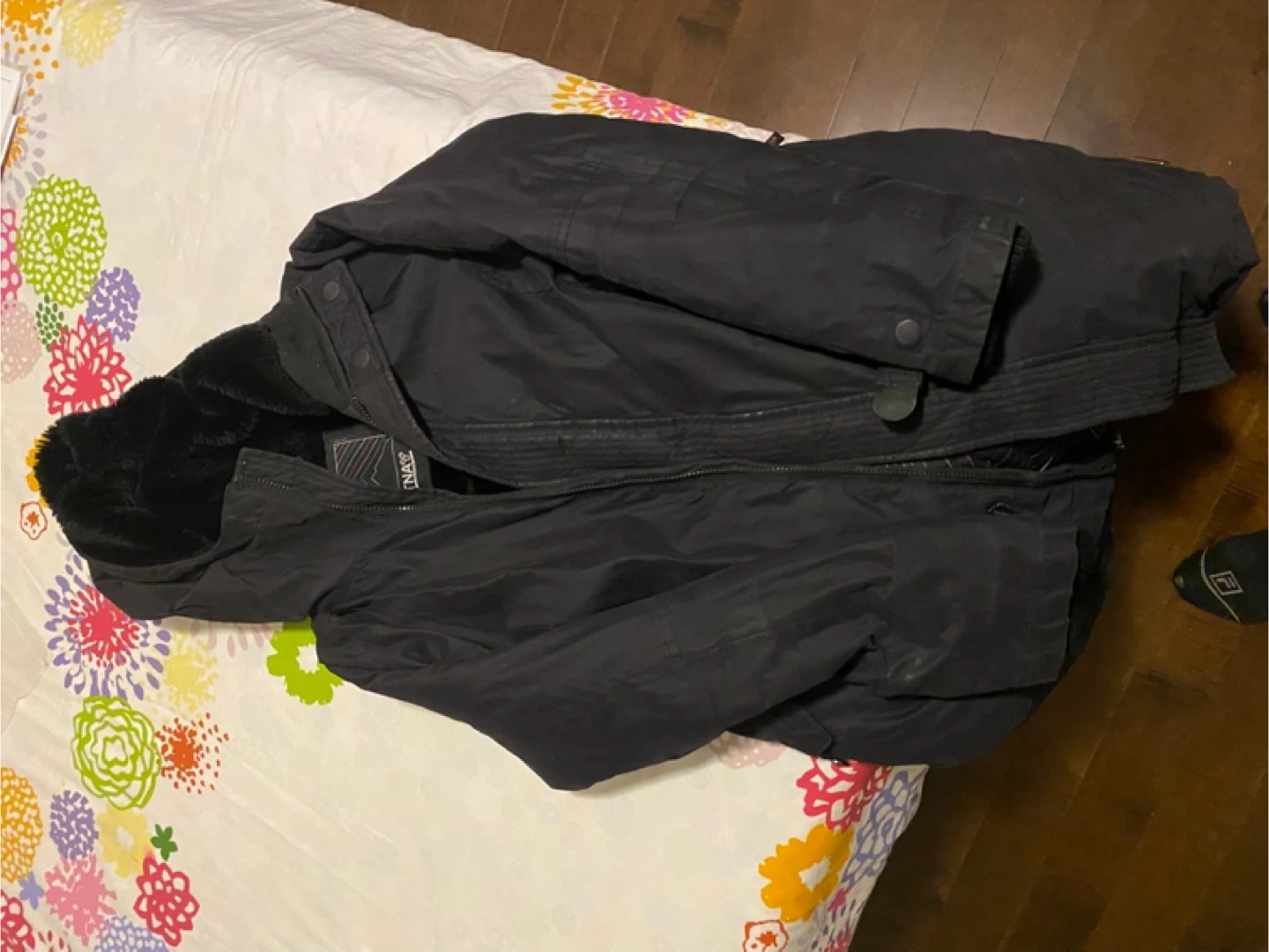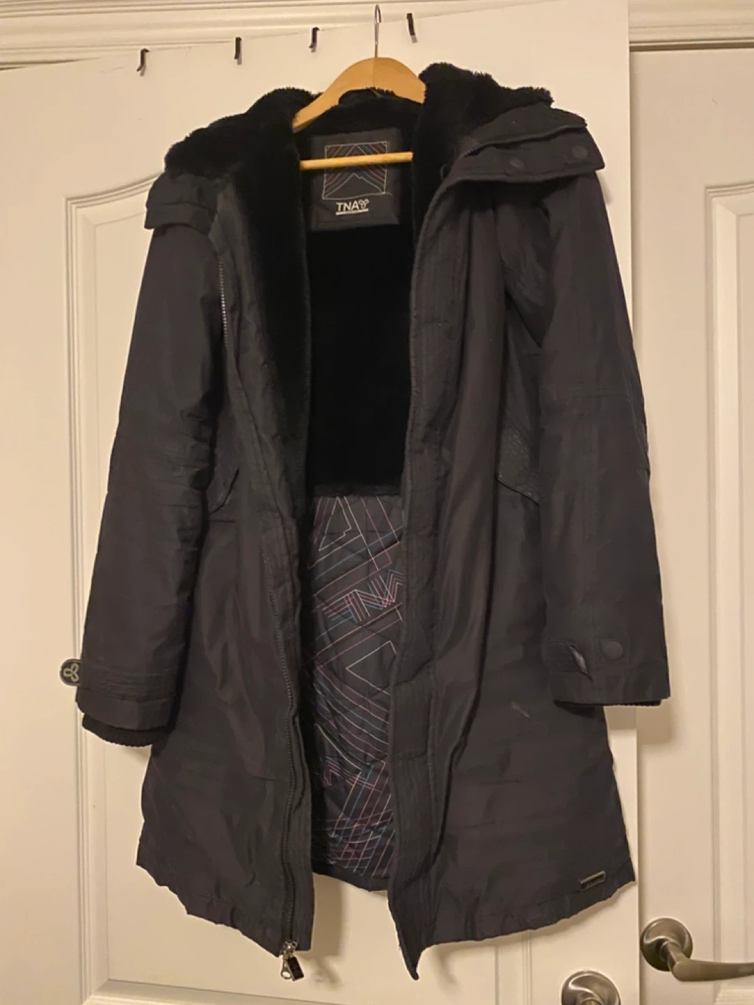 Selling a cozy TNA winter parka in black! It's a size medium and features a warm, faux-fur lining.