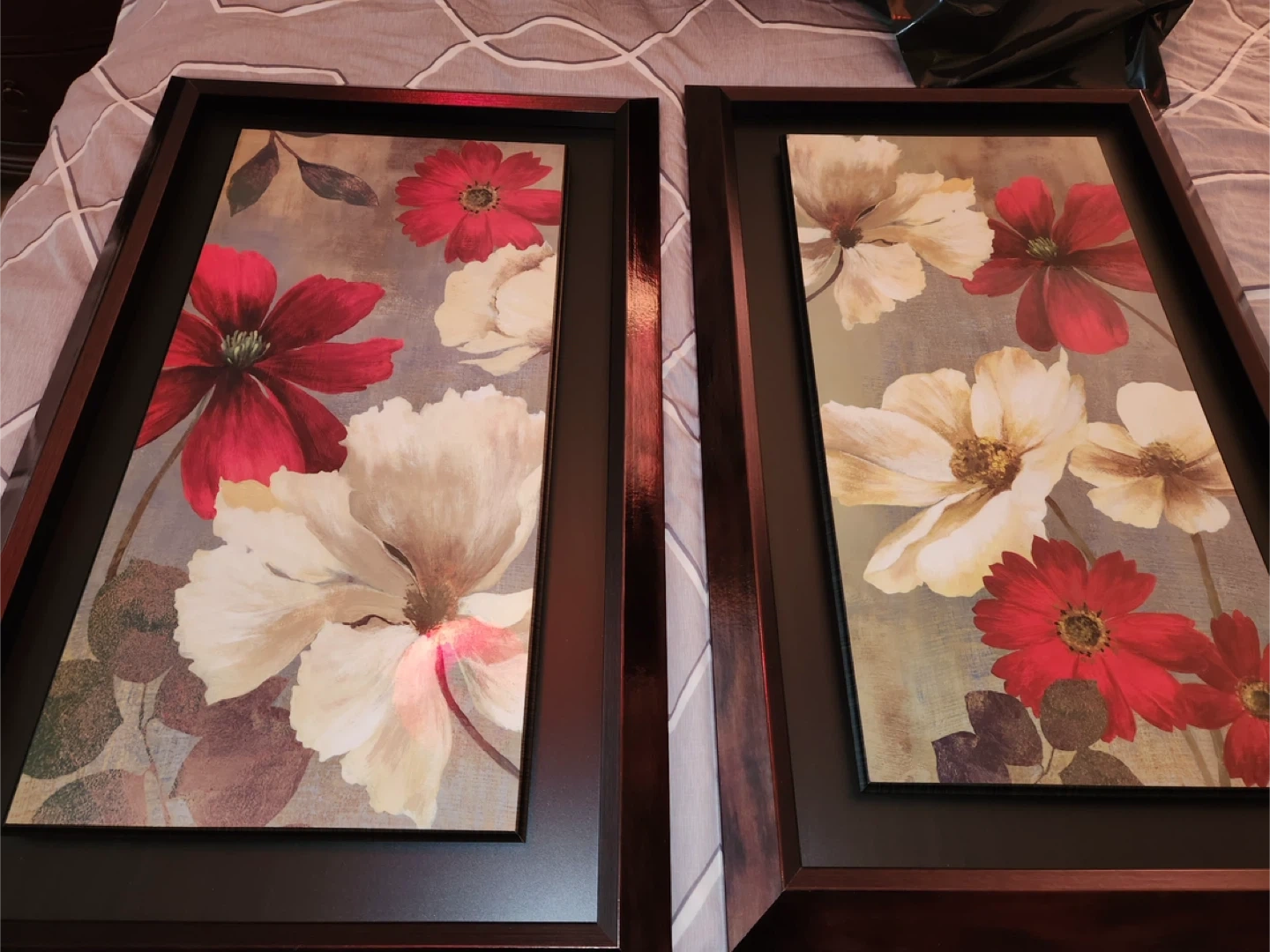 Selling a set of two framed floral wall art pieces. They feature a lovely design with red and white flowers on a grey background, framed in a dark brown wood. They'd be a great addition to any room!