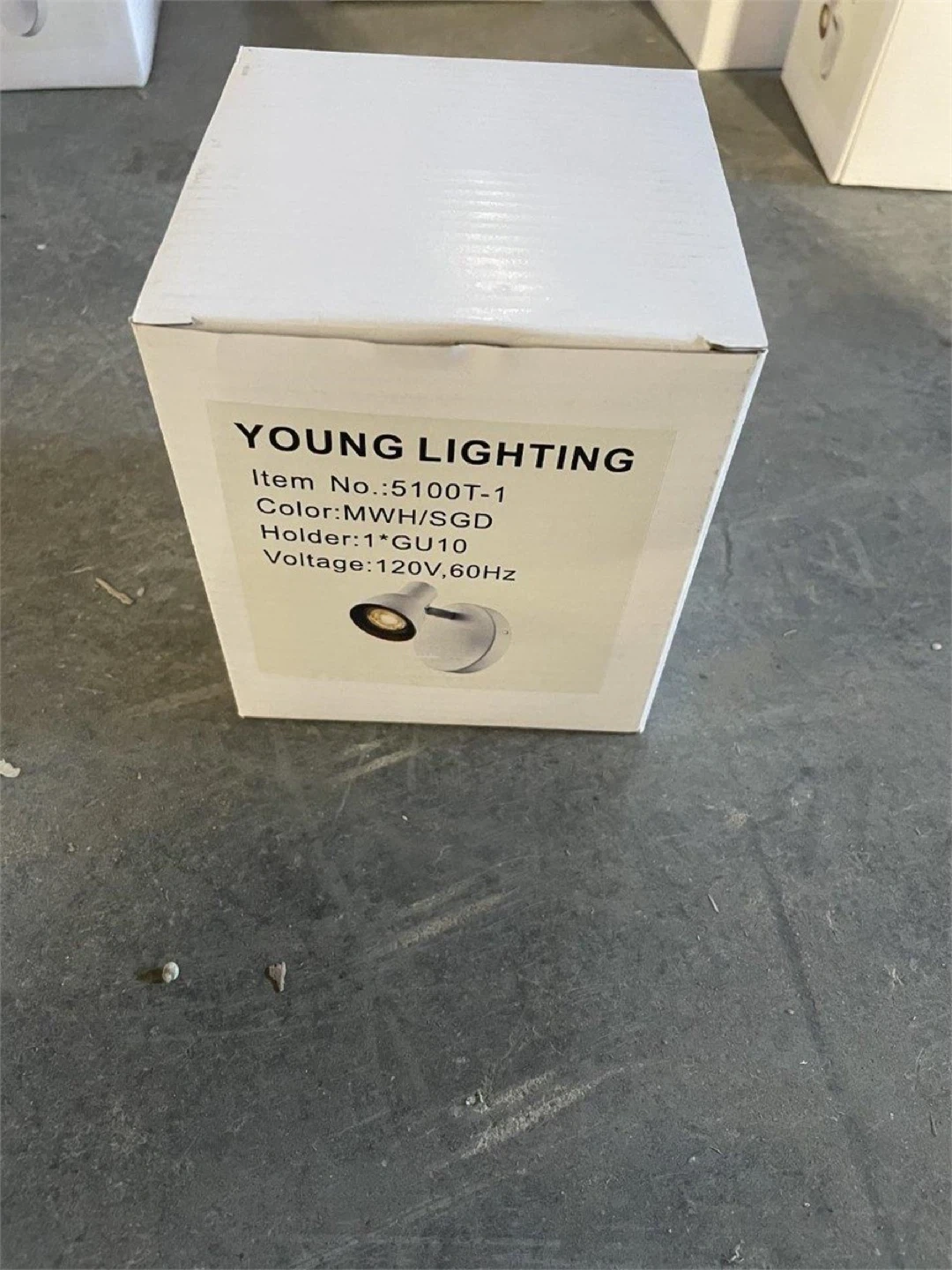 I'm selling a YOUNG LIGHTING wall lamp in white! It's in great condition and comes with the original box. The item number is 5100T-1, and the holder is 1*GU10. It operates at 120V, 60Hz