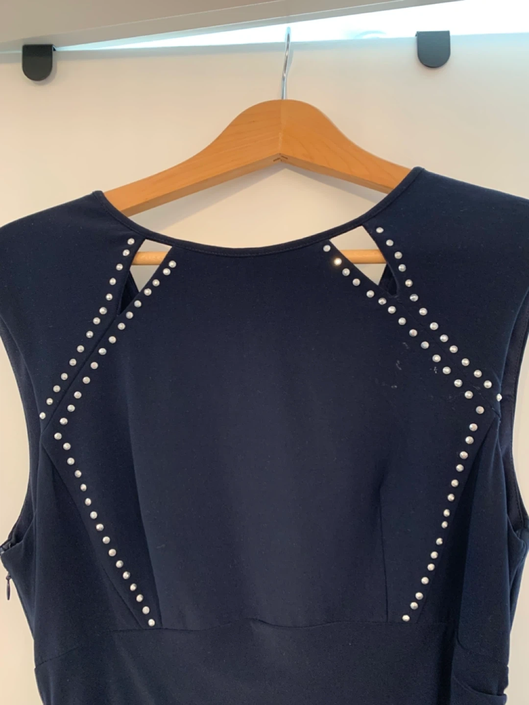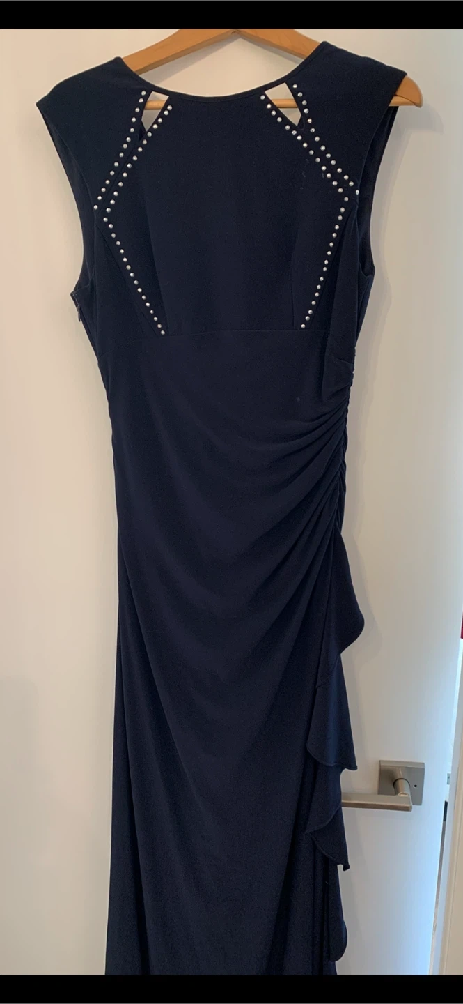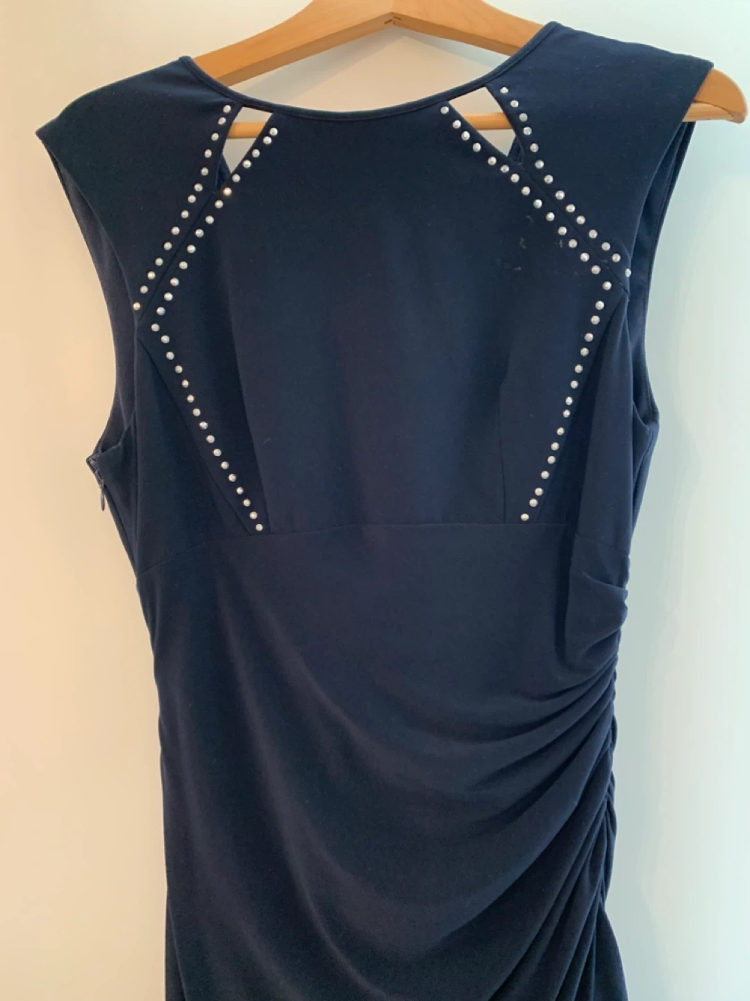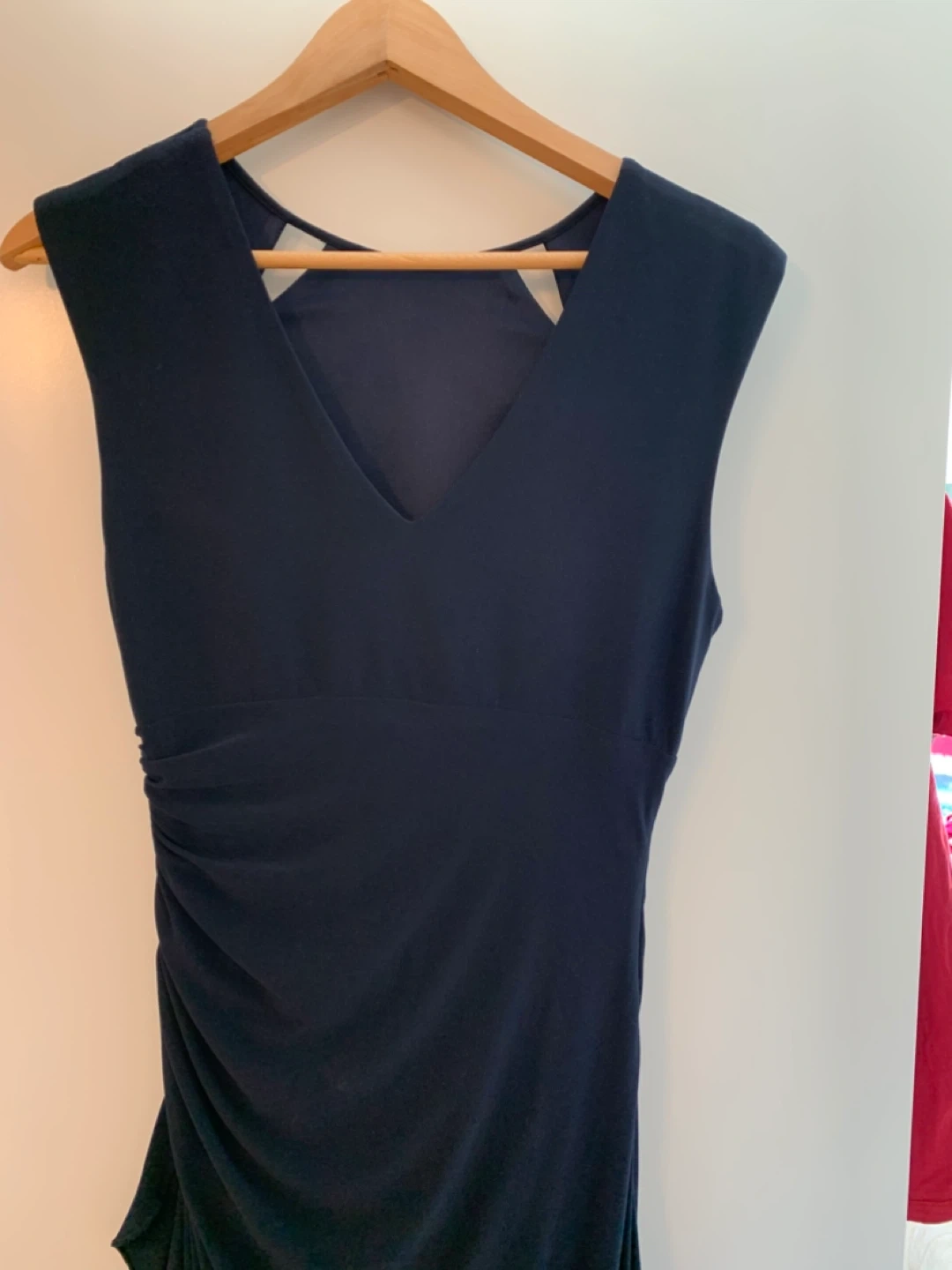 A lovely navy blue sleeveless dress with a unique design on the back. It has a v-neck and ruching on the side. Perfect for a night out or a special occasion!
