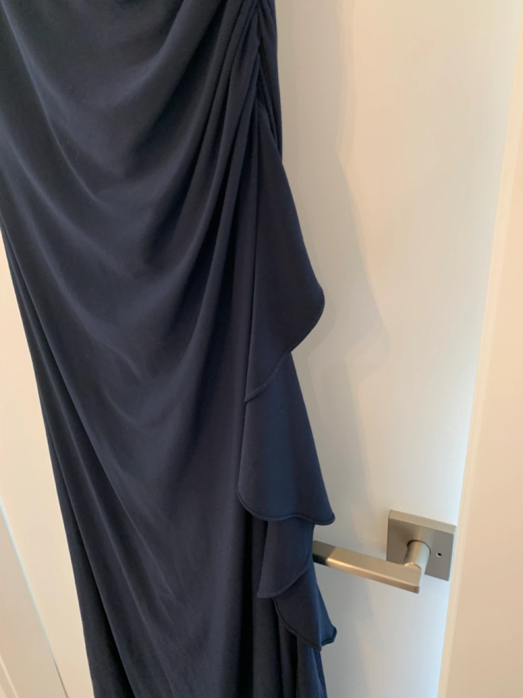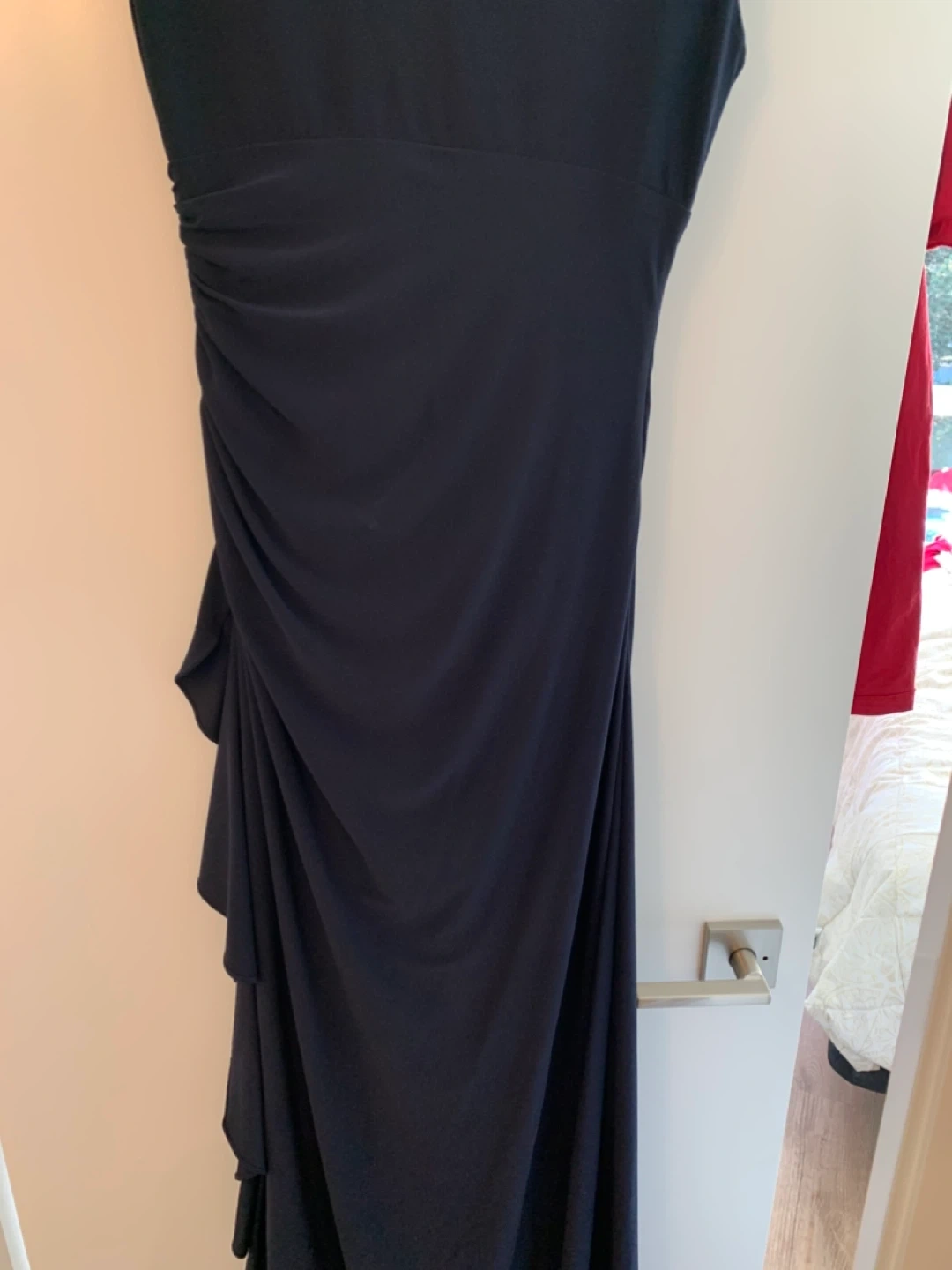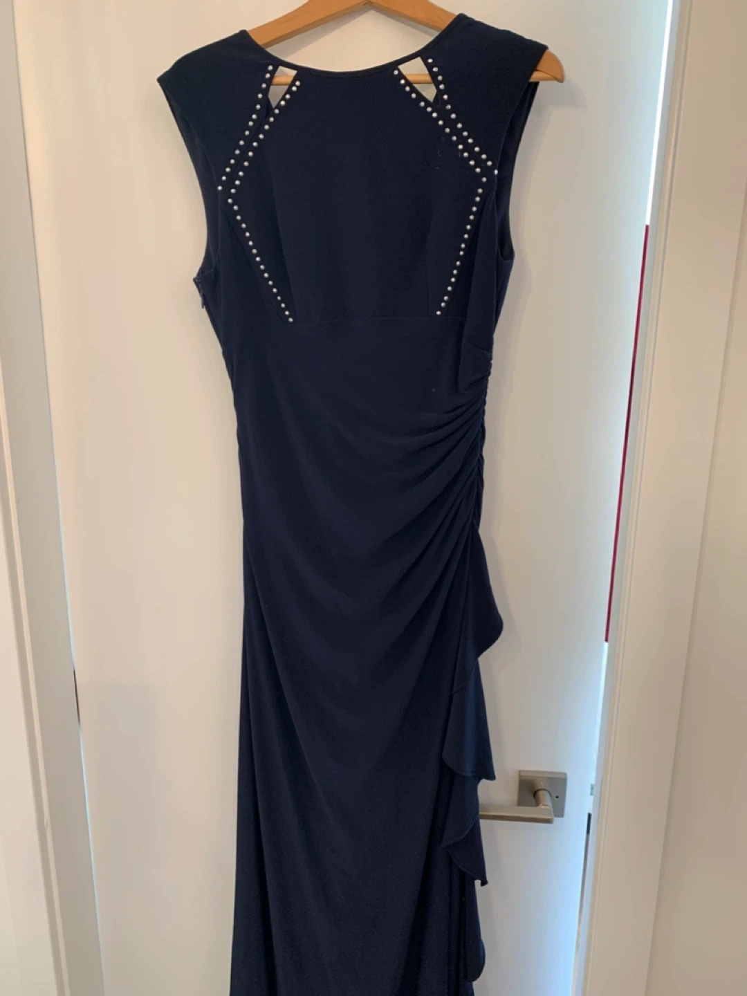 A lovely navy blue sleeveless dress with a unique design on the back. It has a v-neck and ruching on the side. Perfect for a night out or a special occasion!