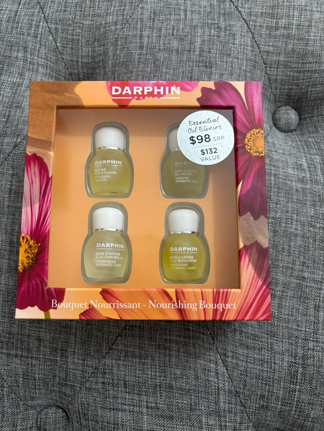 Selling a Darphin Essential Oil Elixirs Nourishing Bouquet set! This set includes four aromatic care elixirs: Nectar aux 8 Fleurs, Soin d'arome au Jasmin, Soin d'arome a la Camomille, and Soin d'arome a la Mandarine. The set originally retailed for $98 SRP and has a value of $132. Perfect for anyone looking to try out a range of Darphin's essential oil blends