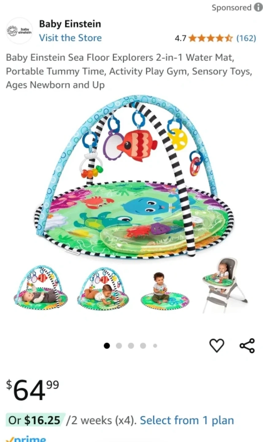 Selling a Baby Einstein Sea Floor Explorers 2-in-1 Water Mat. This portable tummy time activity play gym is great for sensory toys and is suitable for ages newborn and up. Retails for $64.99!