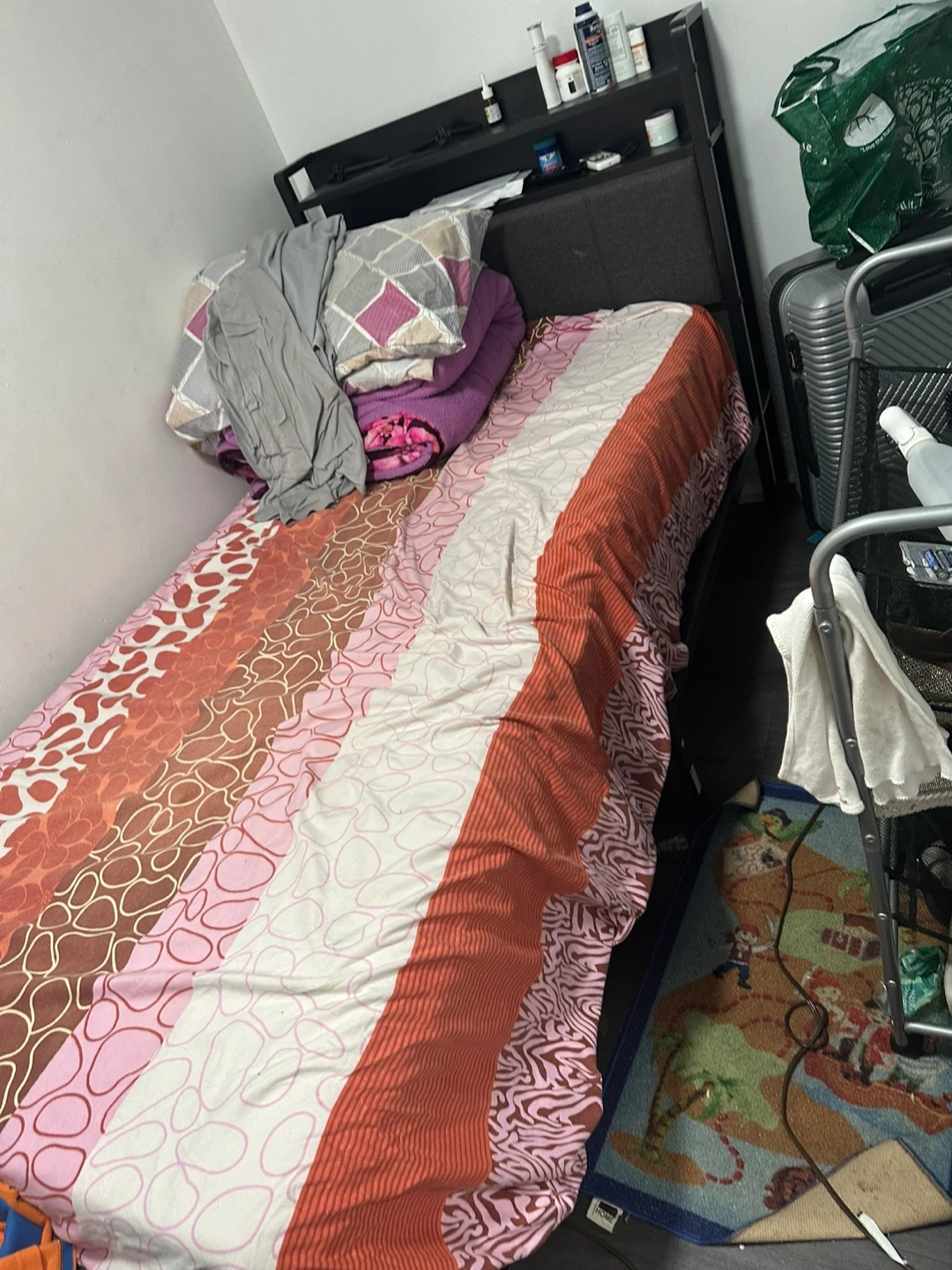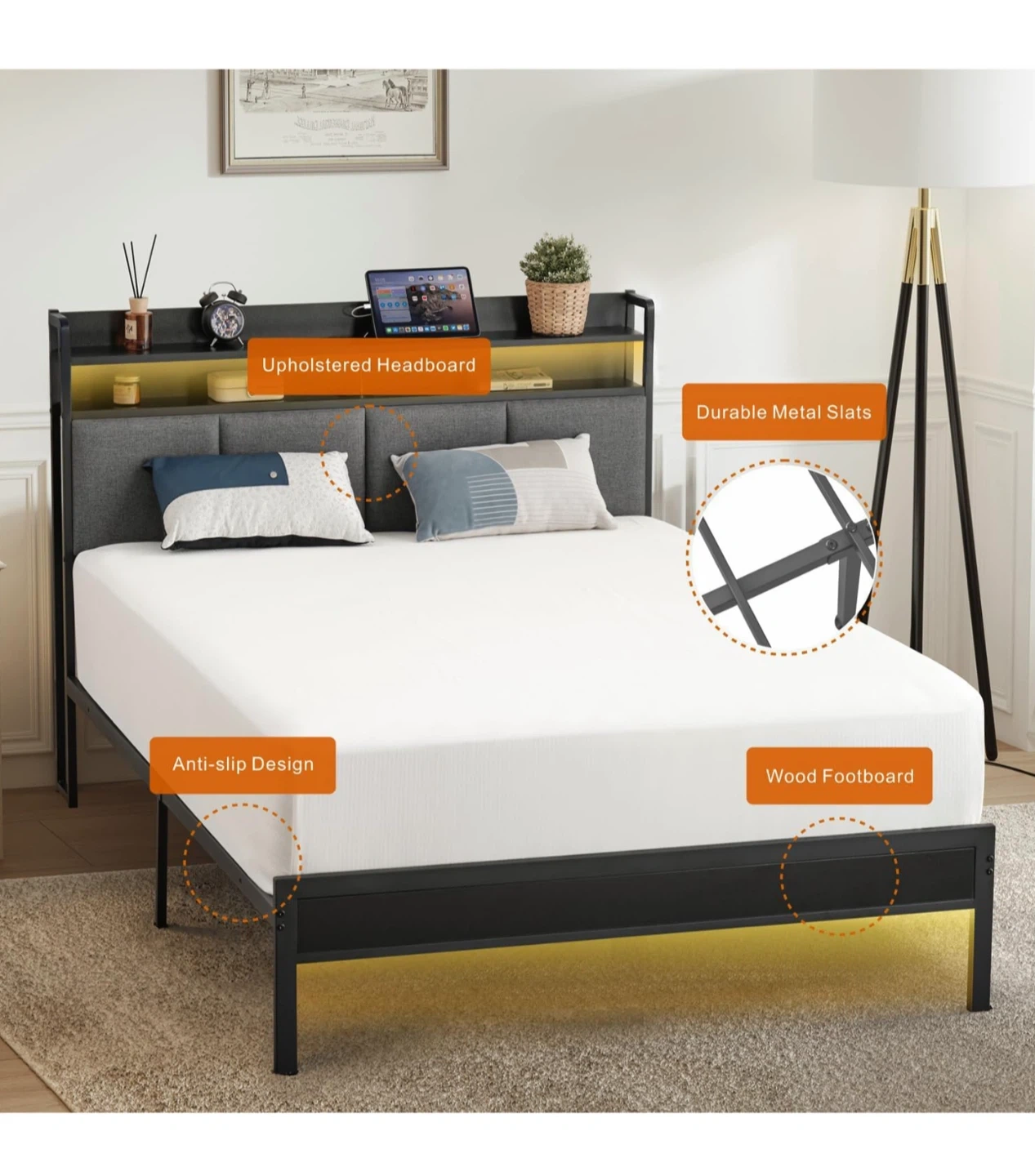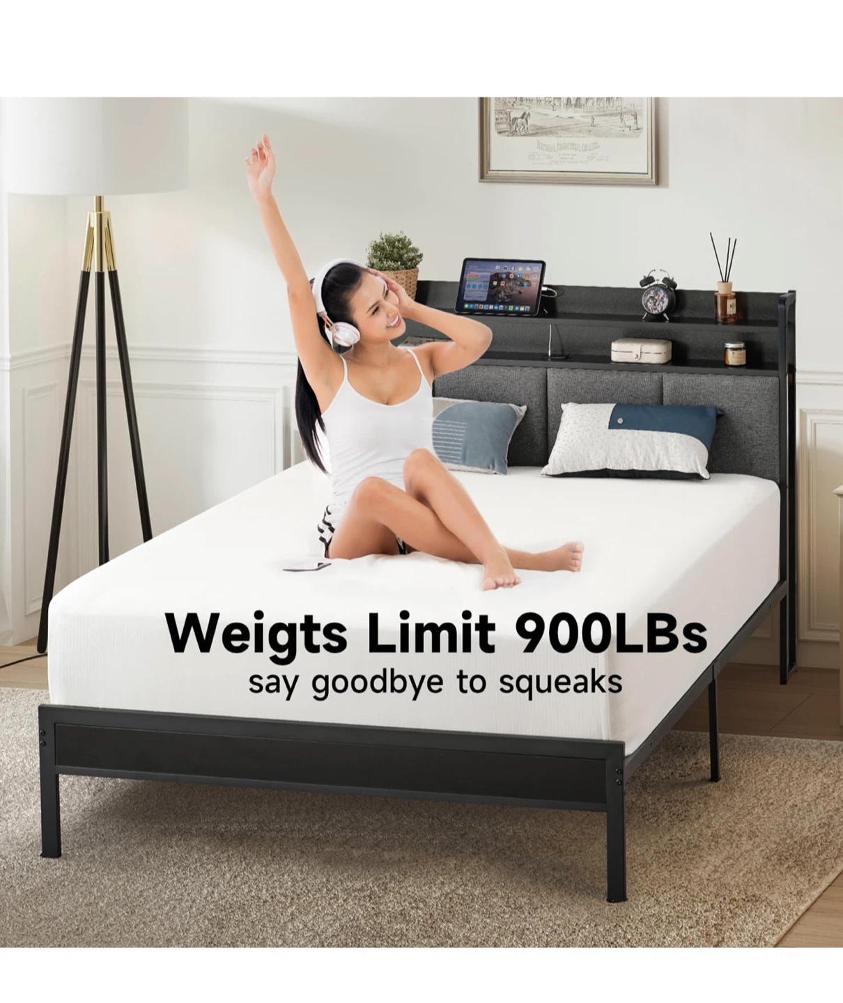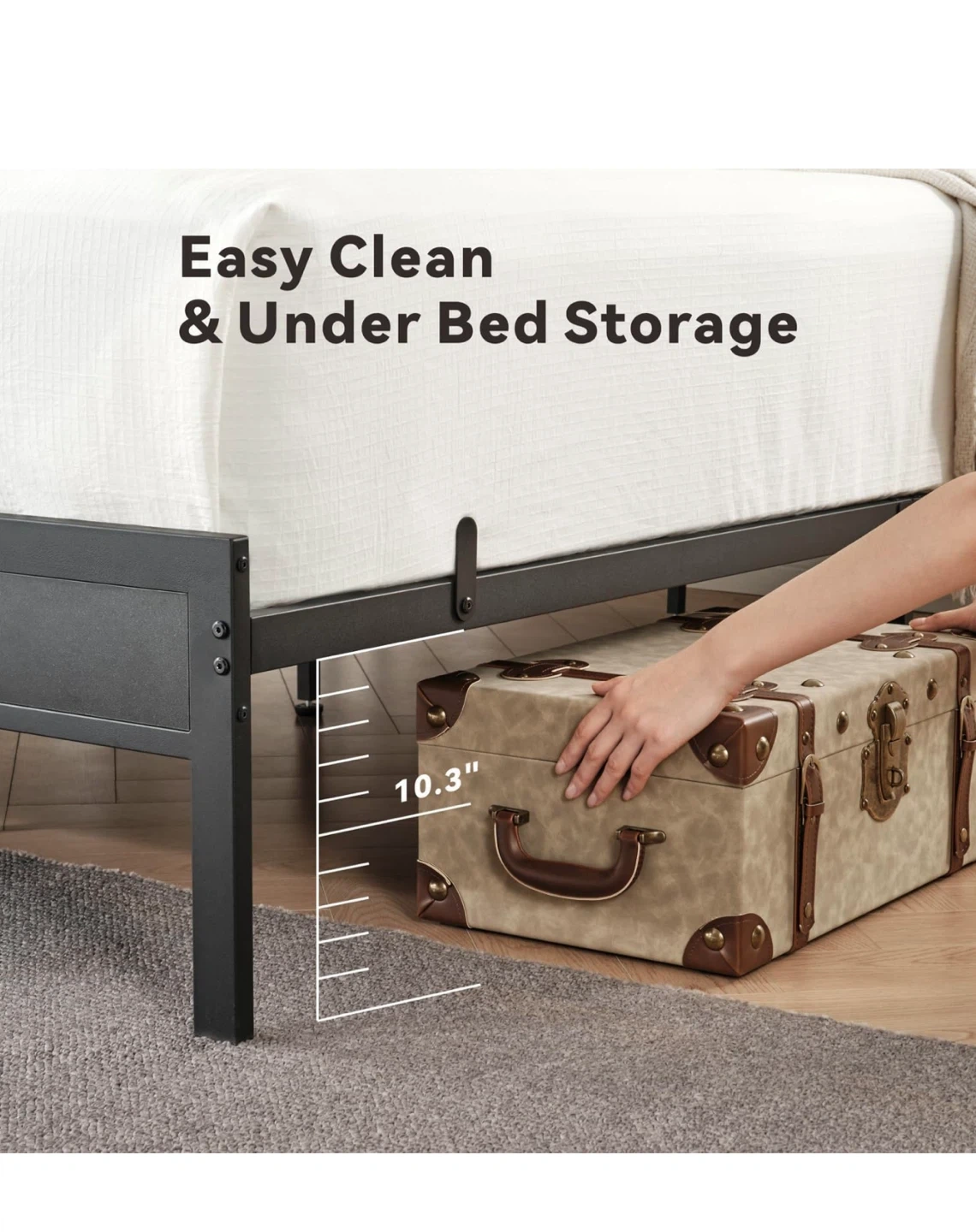 This bed frame features a durable metal frame with wood footboard. It also has an anti-slip design. The upholstered headboard adds a touch of style and the metal slats are durable. It can hold up to 900lbs!