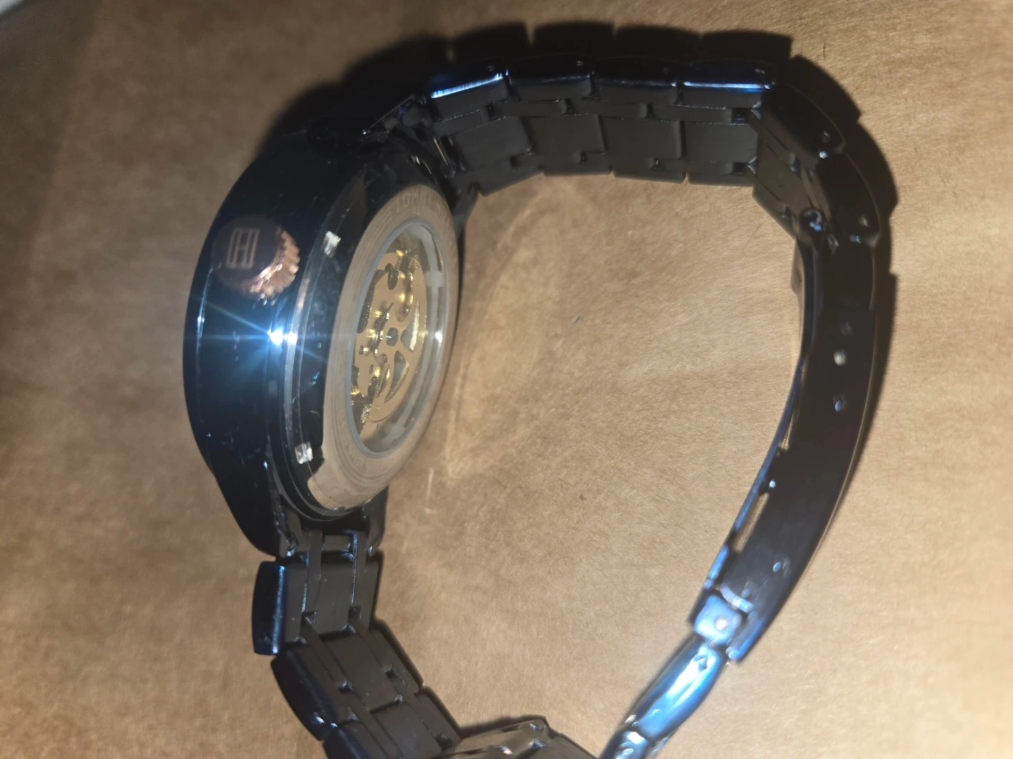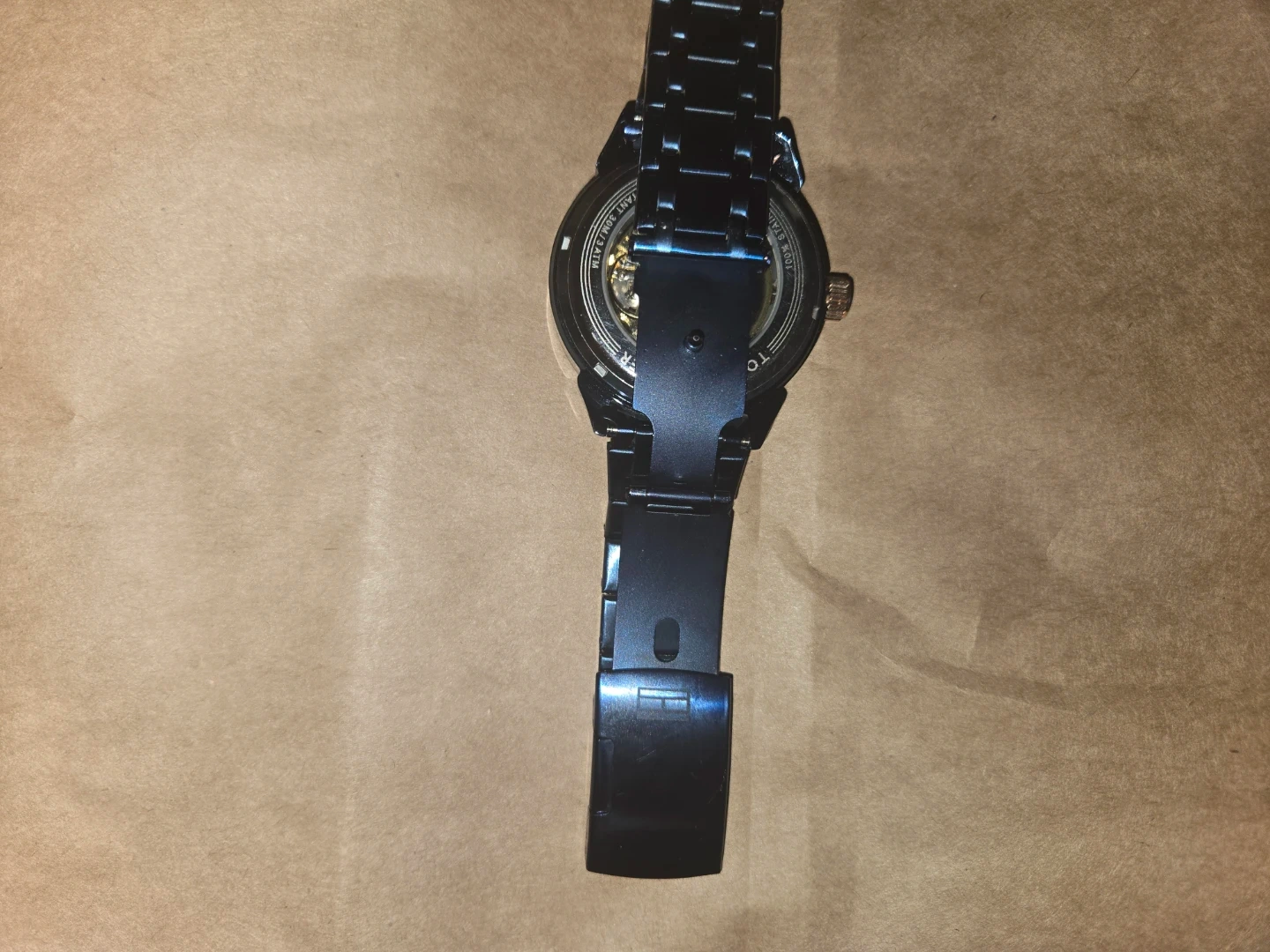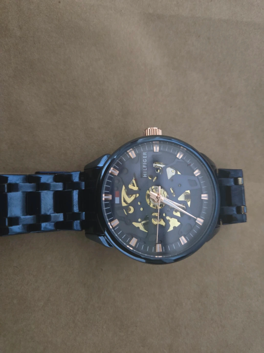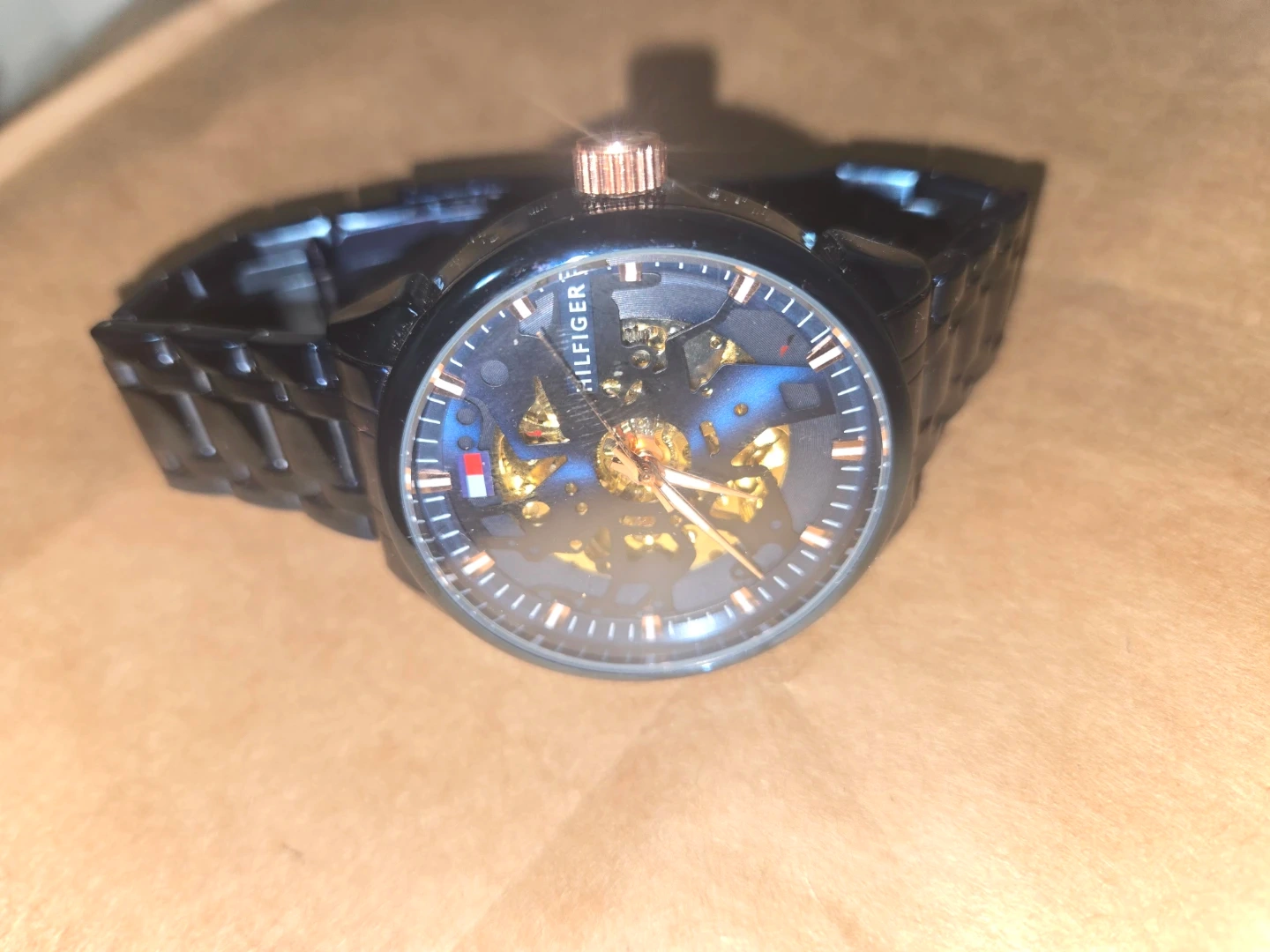 Selling a Tommy Hilfiger automatic watch in deep blue. It has a sleek design with a visible inner mechanism. The watch is just like new.