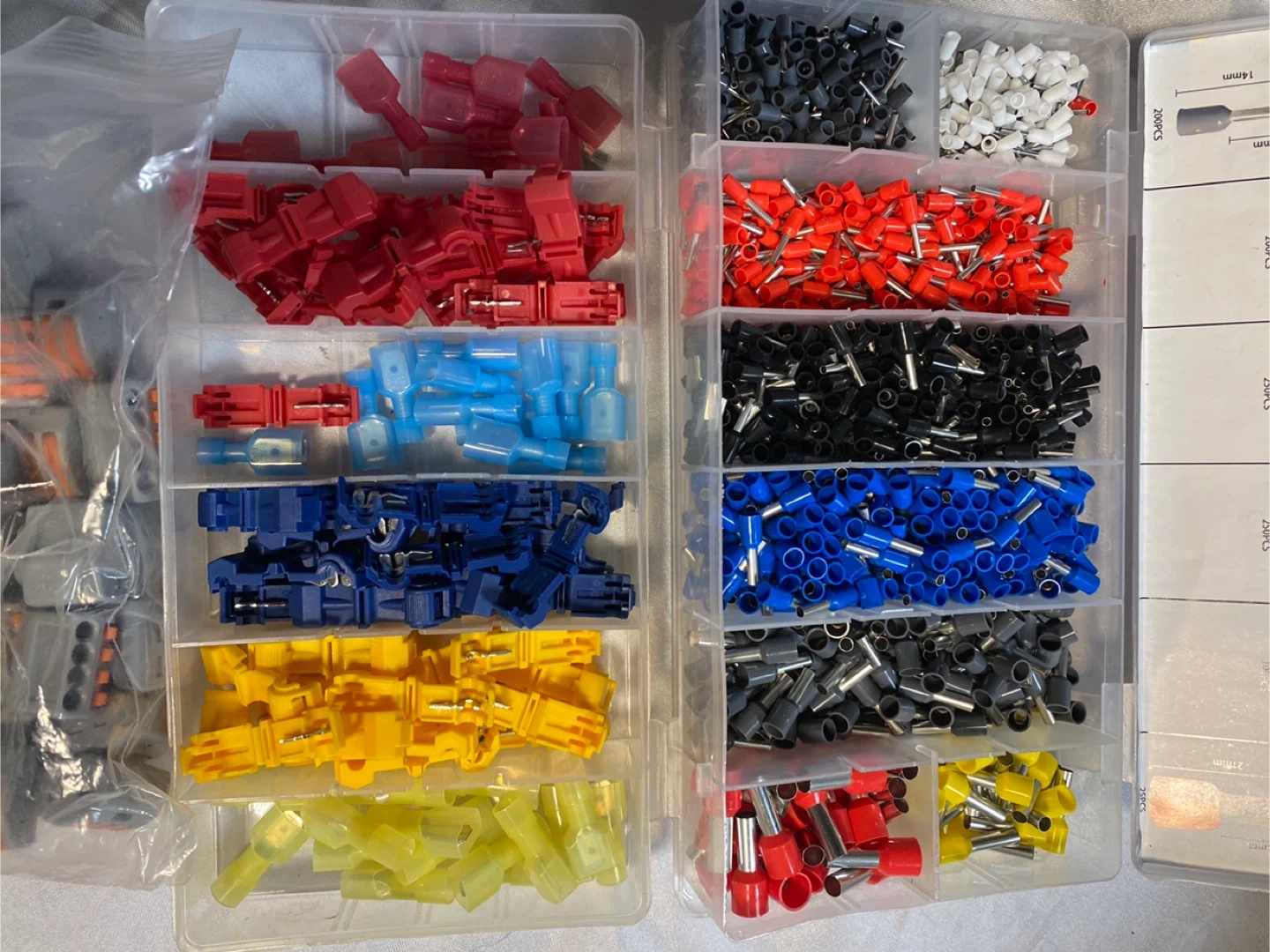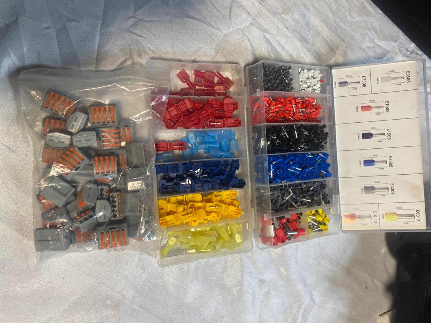 The kit includes quick splice T-tap connectors, insulated male quick disconnect terminals, and push-in lever connectors.