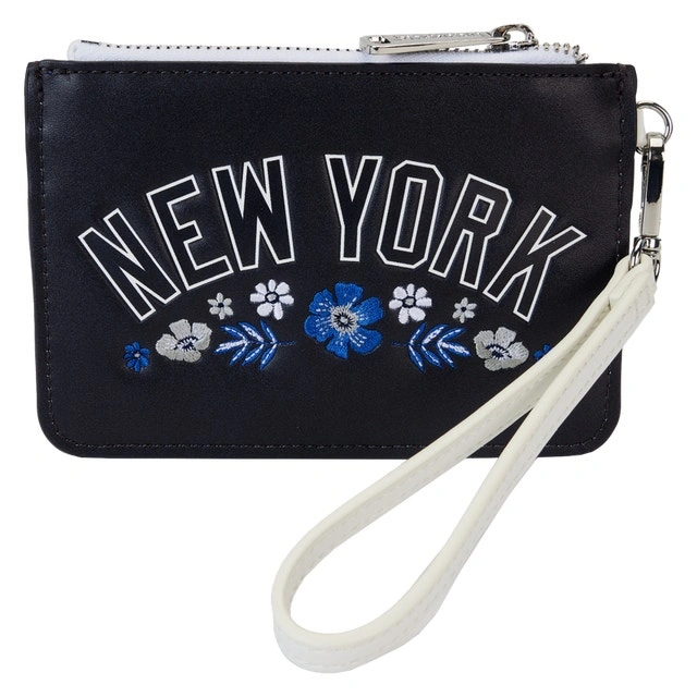 The Loungefly New York Yankees Floral Wristlet Clutch is made of vegan leather (polyurethane). Bag has detachable wrist strap and shiny silver hardware. Additional features include embossed, embroidered, and printed details. Take note of the coordinating inside lining.