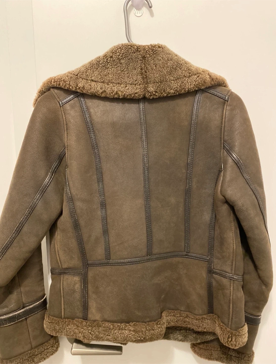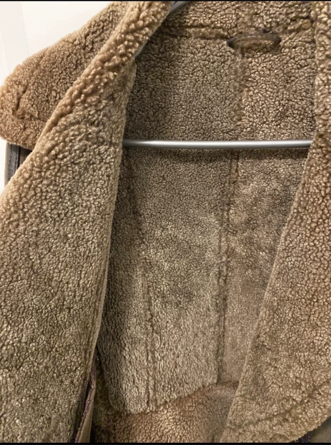 Selling a cozy shearling leather jacket in brown. It's in great condition and perfect for keeping warm during the colder months!