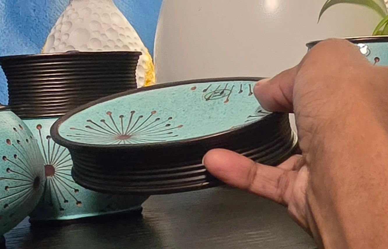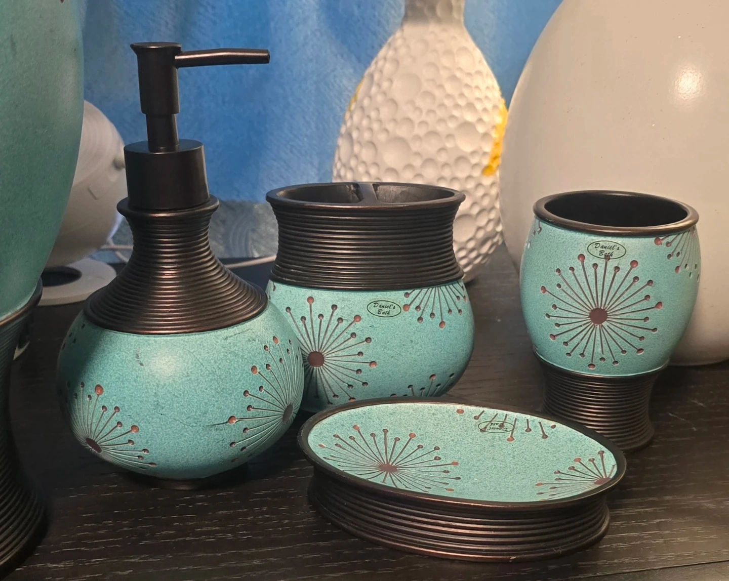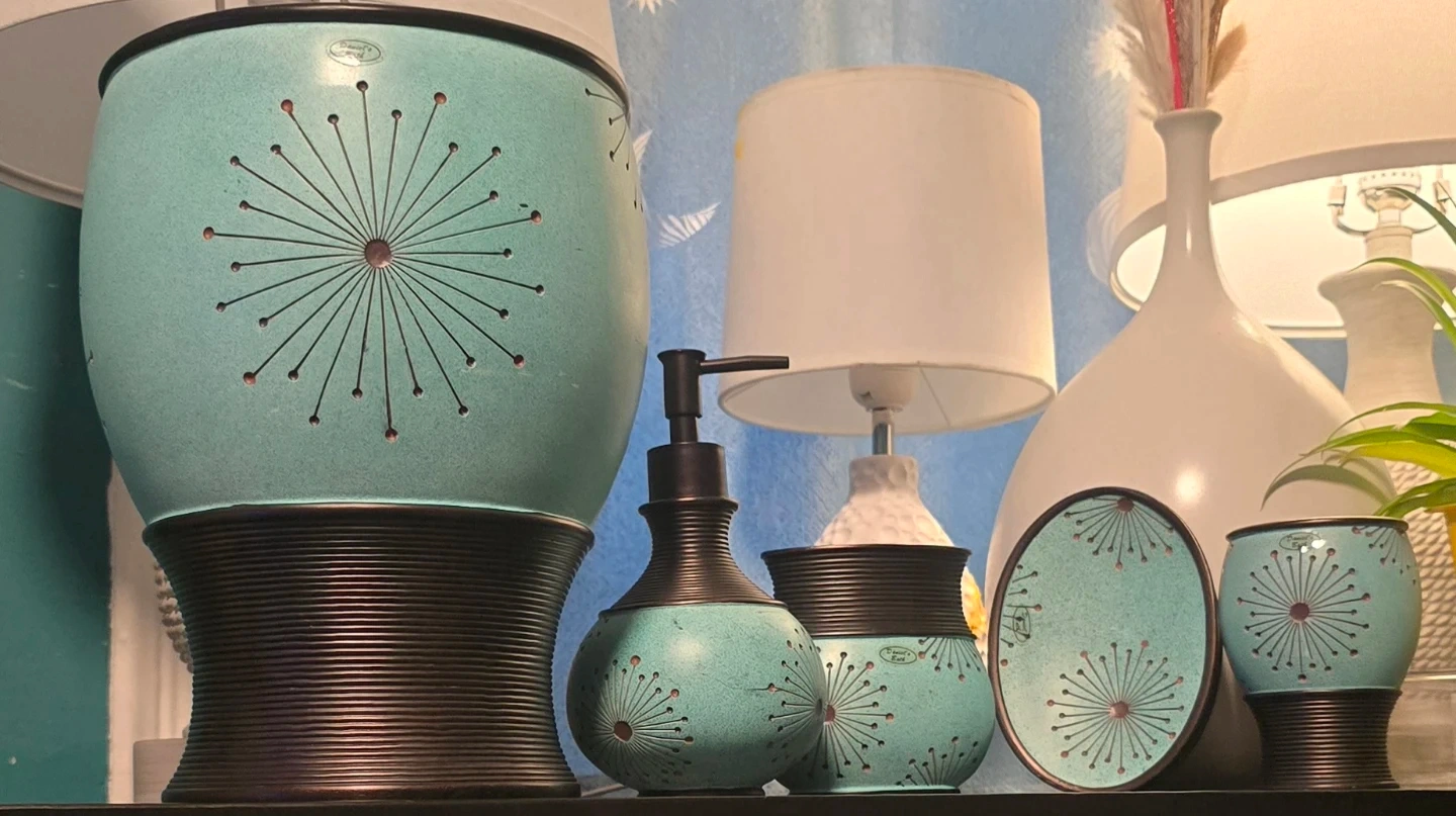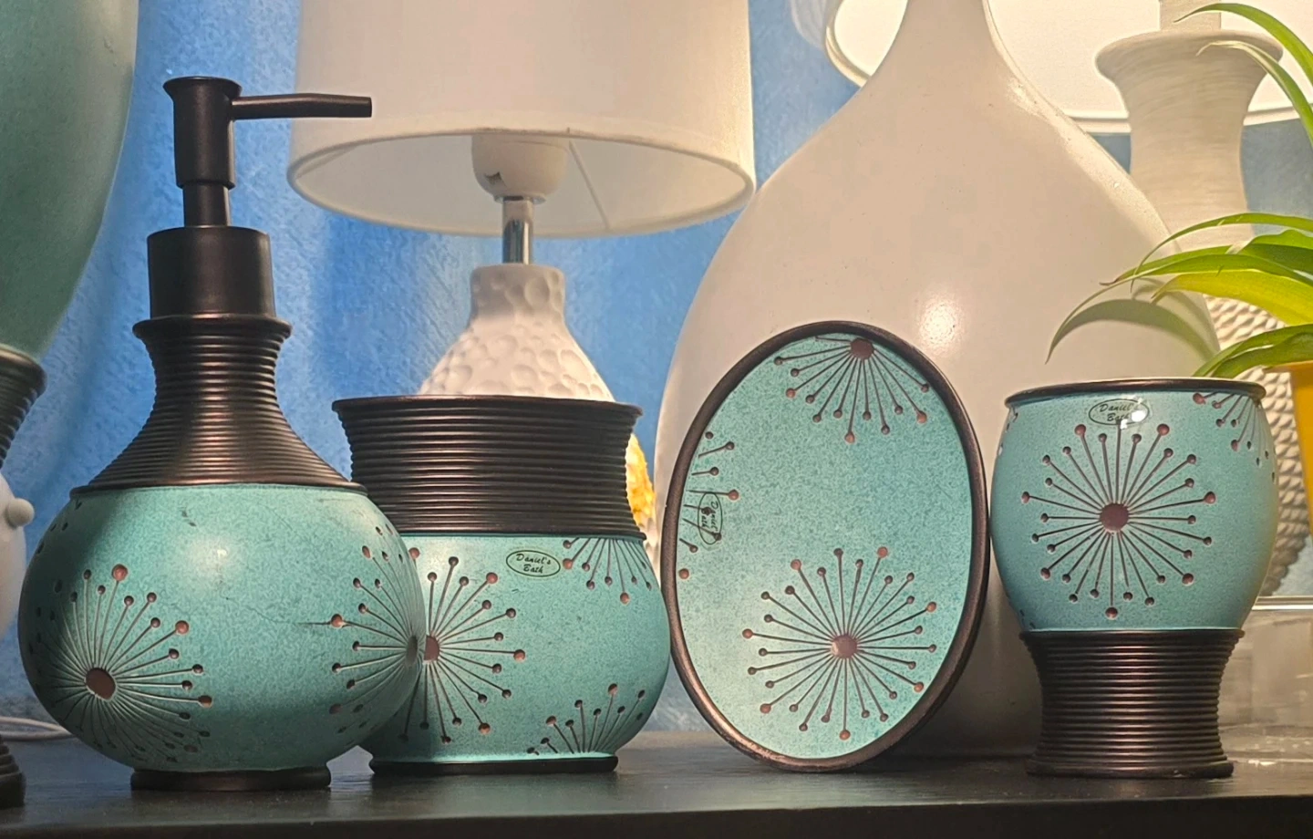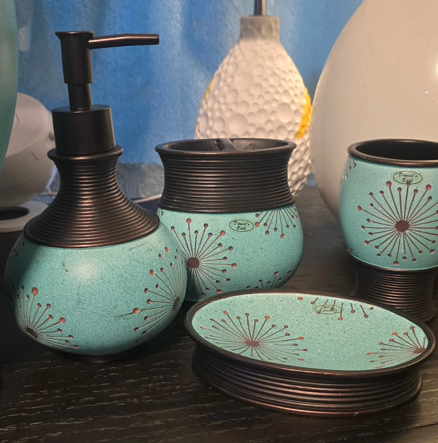 🥕Here's a lovely vintage 4-piece bathroom set from Daniel's Bath! Exquisite great quality piece. features a unique turquoise color with a sculpted handmade dandelion design. This set includes a soap dispenser, toothbrush holder, soap dish and tumbler to complete your bathroom decor. Very beautiful set, excellent condition. Matching trash bin sold separately