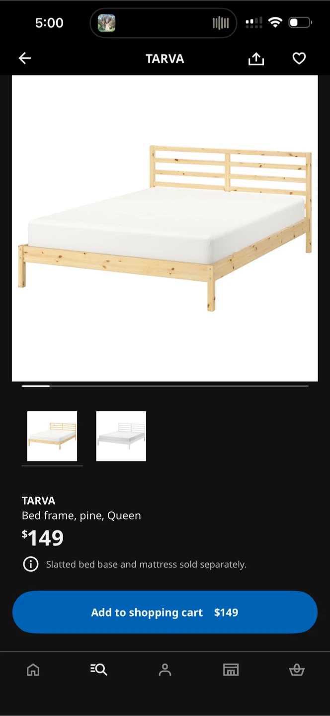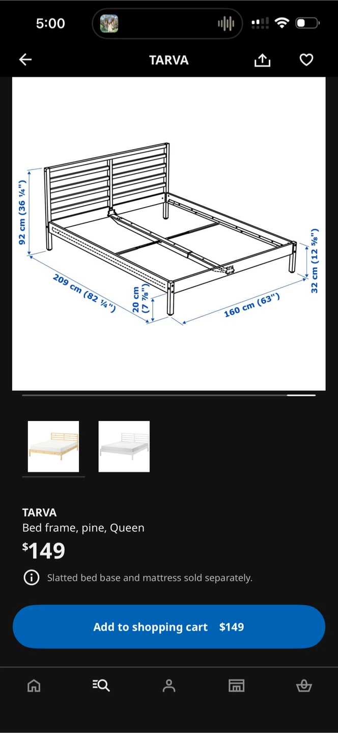 Selling an IKEA Tarva bed frame in queen size. It's made of pine and is in great condition. The original listing price was $149. Mattress and slatted bed base are sold separately.